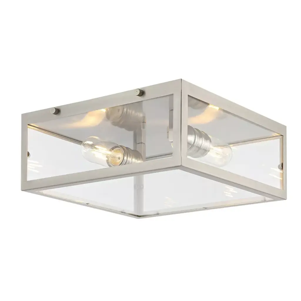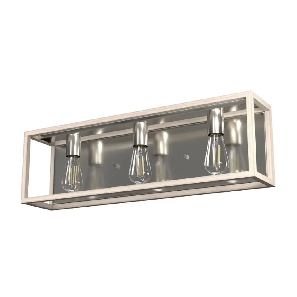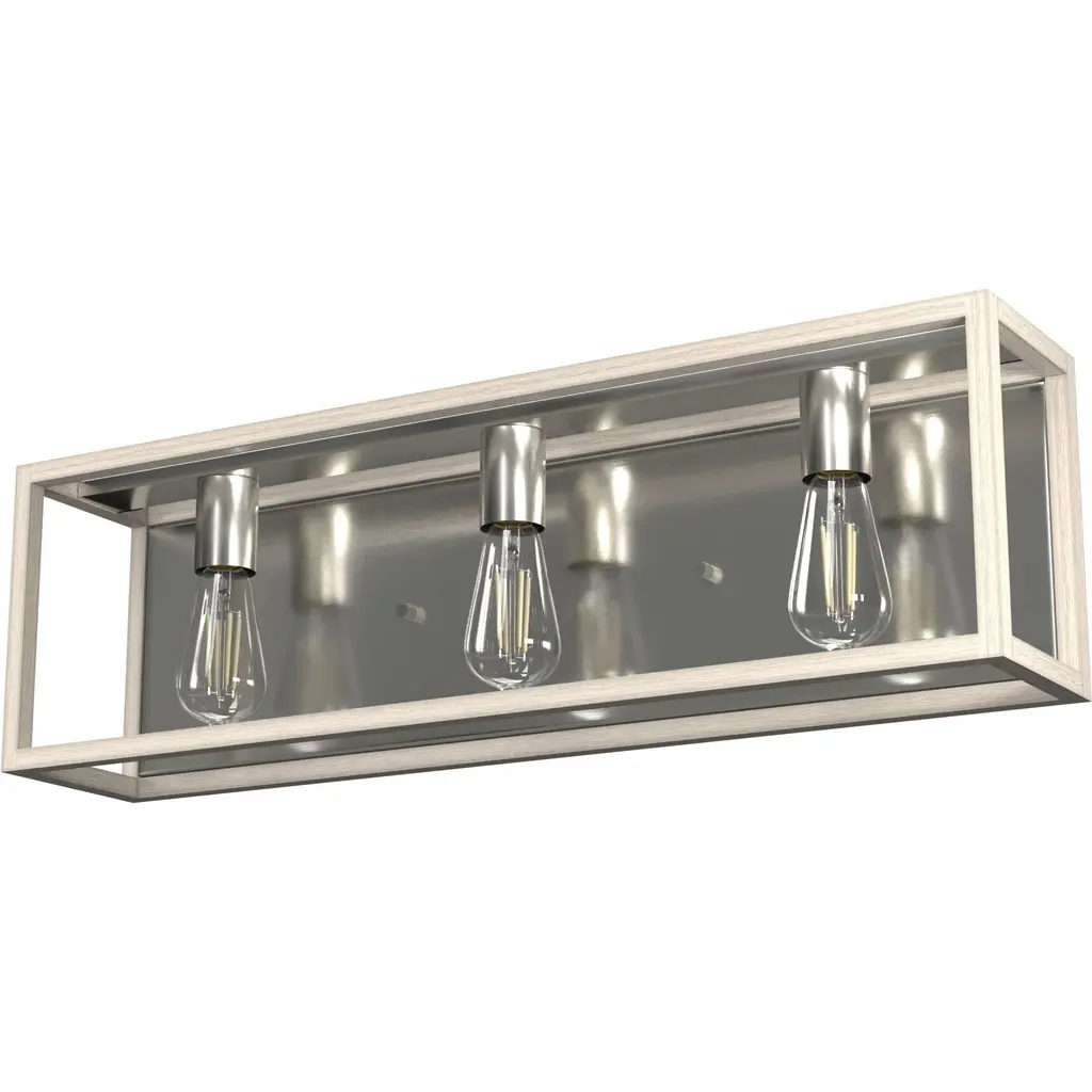 Material: Metal, Finish Color: Brushed Nickel, Width: 17", Height: 7.5", Depth: 5", Backplate Width: 17", Backplate Length: 7.5", Lamping Type: Incandescent, Number Of Bulbs: 2, Wattage: 60 Watts, Dimmable: Yes, Moisture Rating: Damp Rated