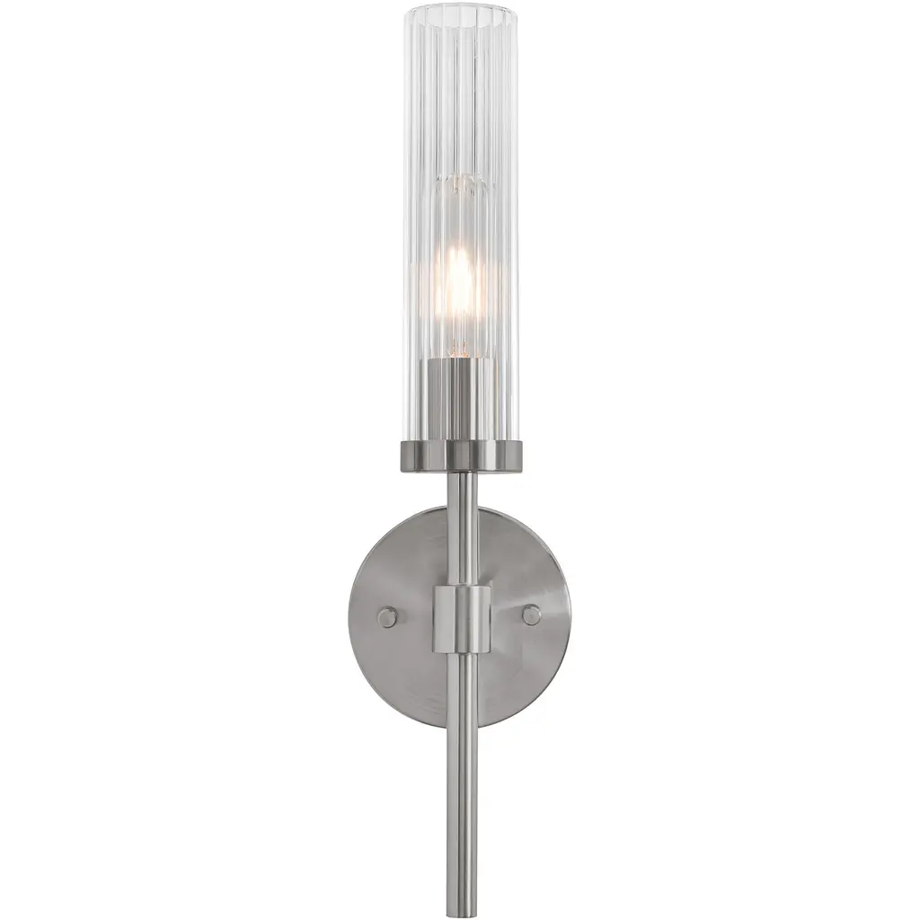 The Huntington Wall Sconce is a modern and stylish addition to any room. Made with a robust steel framework and a ribbed glass shade, this fixture diffuses light beautifully, creating a warm and inviting ambiance. It is perfect for enhancing your hallway, foyer, or office with a contemporary touch.