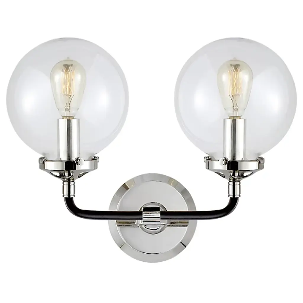 Bistro Double Light Curved Sconce in Polished Nickel and Black with Clear Glass
