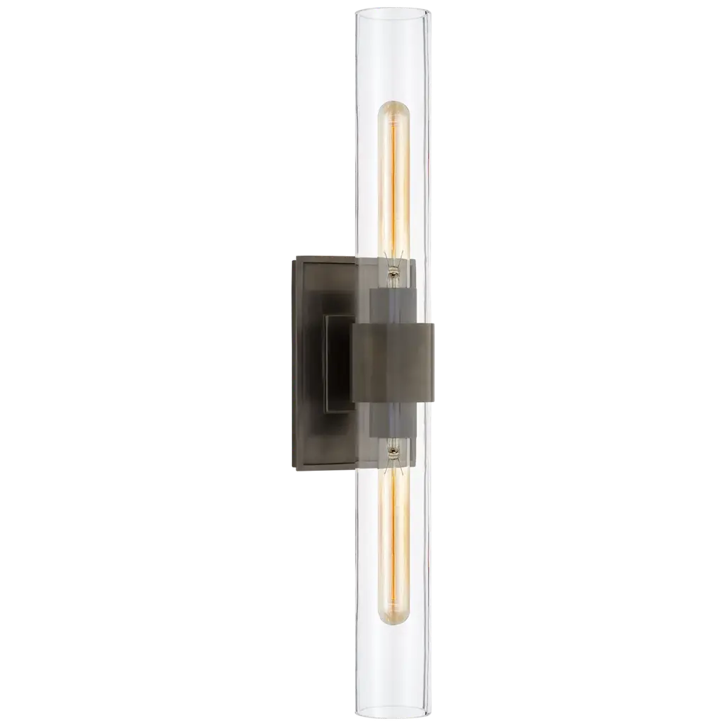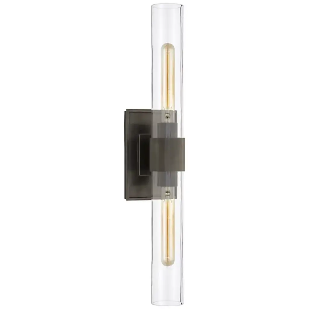 Presidio Petite Double Sconce in Bronze with Clear Glass Designer: Ian K. Fowler Height: 23" Extension: 4.5" Backplate: 4.5" x 7" Rectangle Mounting: Hardwire Shade Detail: Clear Glass Socket: 2 - E26 Keyless Wattage: 2 - 60 T10 Safety Rating Location: Damp