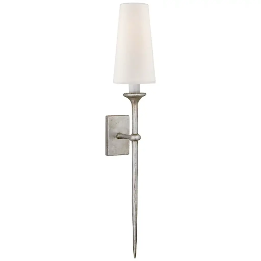 Timeless elegance with a gothic touch. Sharp, pointed contours follow the trim figure of the Iberia Wall Sconce from Visual Comfort Signature, formerly known as Visual Comfort, It’s a piece that columns and architectural features will embrace through its long and slim quality. Like a sharp stake, a long-tailed stem narrows to a point, wrapped with a bold, rustic texture. A linen shade jets towards the ceiling as a cool shape. Radiant light flows out of the opaque form with a warming feeling.