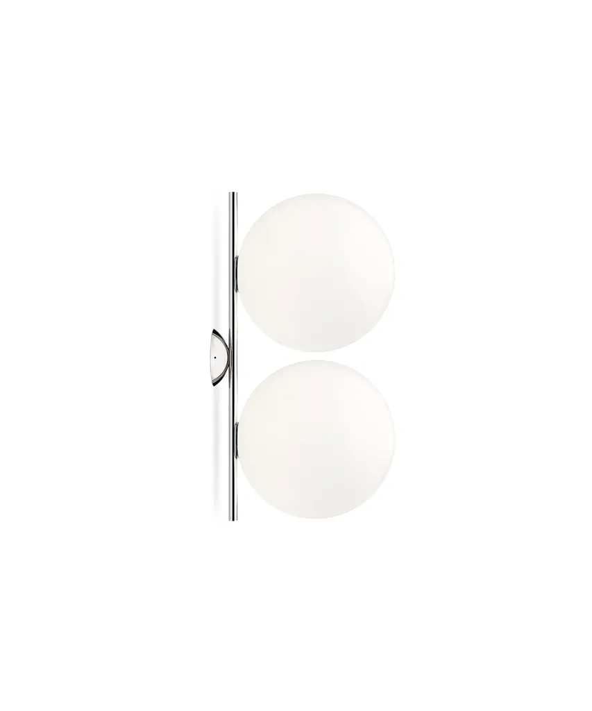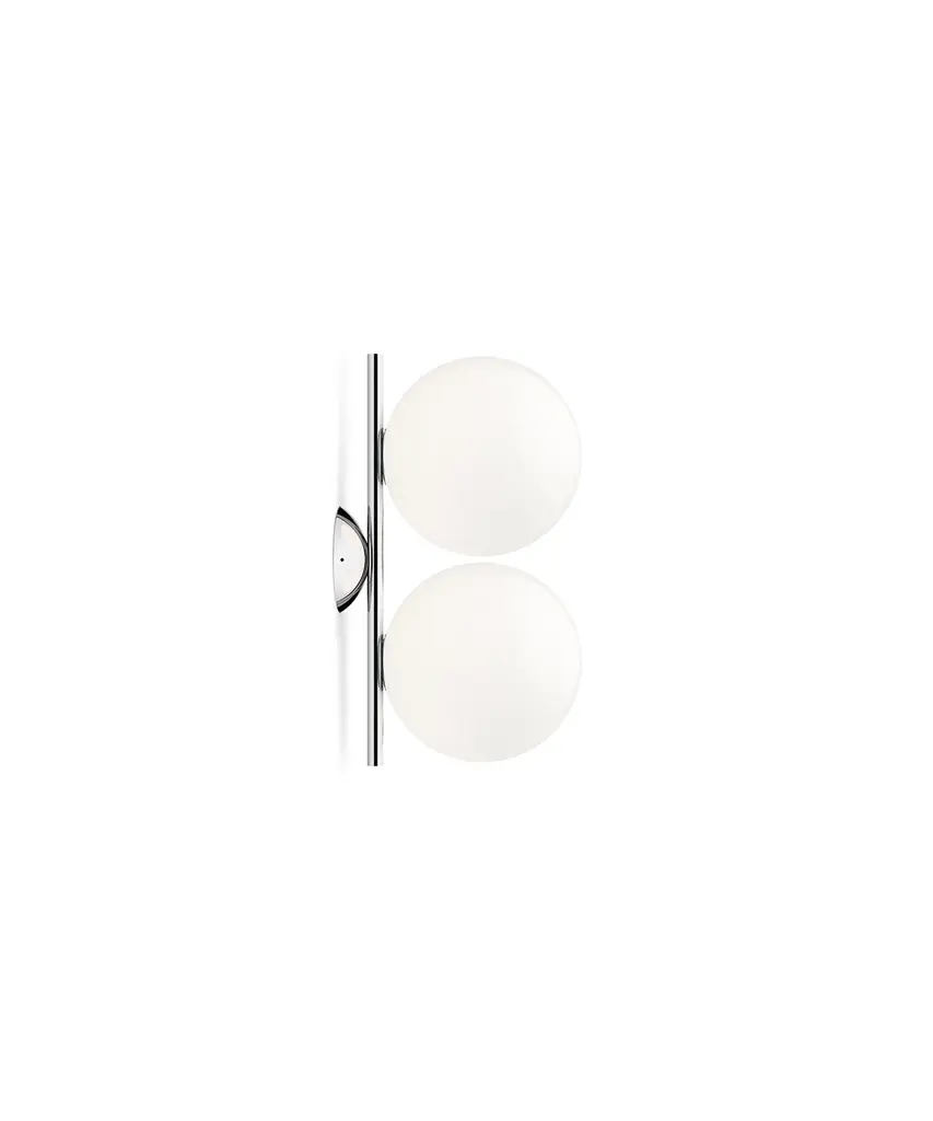 The latest addition to the IC Lights Collection: New IC Lights Ceiling/Wall Double comes with a double light source providing diffused light. The modern ceiling and wall sconce fixture gives a sense of serene calm and elegance to any stairwell, entryways, or hallway. New IC Lights Ceiling/Wall Double can be mounted on any wall or on the ceiling. Frame available in brass, black, chrome, and our newly launched red burgundy finish. Blown glass opal diffuser. The IC Lights collection showcases designer Michael Anastassiades' love of industrial simplicity as well as his profound technical skill. This authentic design is produced in Italy exclusively by Flos.