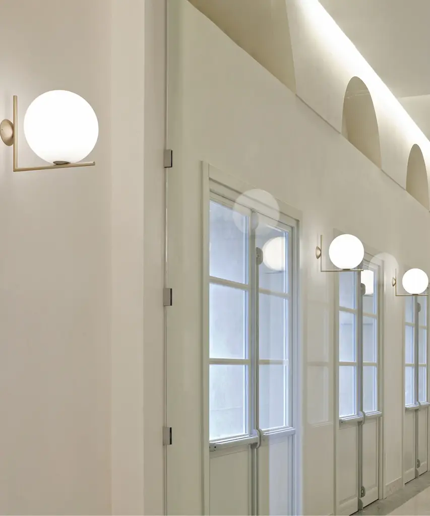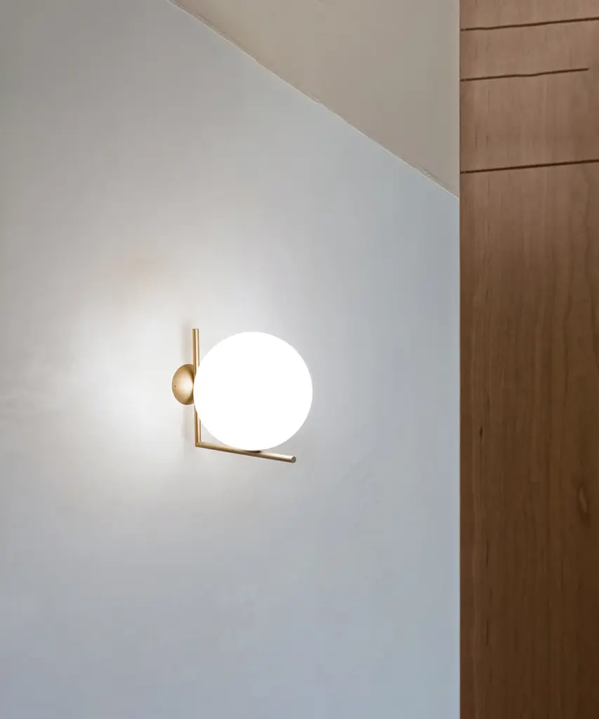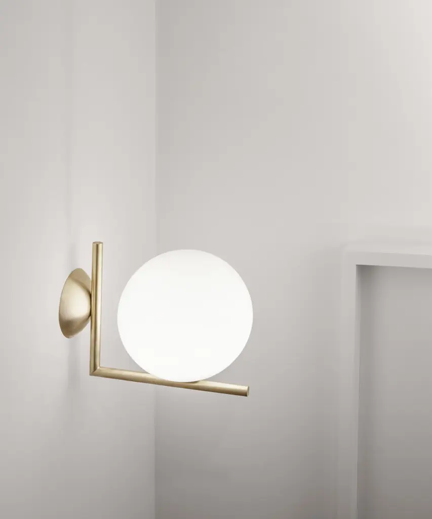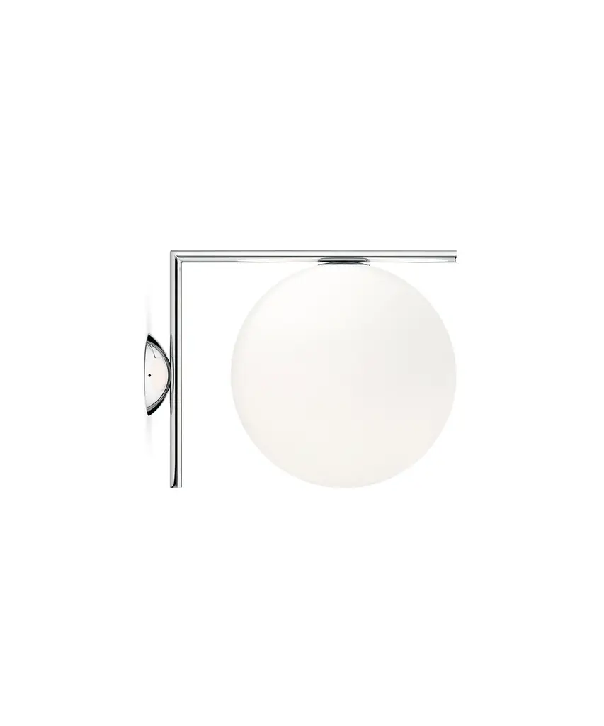 Radiant light, delicate balance: Like the other pieces in his IC Light Series, the IC C/W ceiling and wall lamp showcases designer Michael Anastassiades' love of industrial simplicity as well as his profound technical skill. The sleek, modern ceiling/wall lamp has a blown glass opal glass design that provides diffused lighting as well as a sense of serene calm to any hallway, living room, or bedroom. The frame comes in brass or chrome finish steel. IC Lights C/W can be mounted on any wall or mounted on the ceiling. Poise is powerful: That's the message Michael Anastassiades offers with his IC Light Series. From the skillful balance of the sphere and baton that invokes thoughts of a dexterous juggler's act to the lamp's name-IC, a reference to the identity code used to evaluate immigrants entering the UK-the designer makes a commanding statement. This authentic design is produced in Italy exclusively by Flos.
