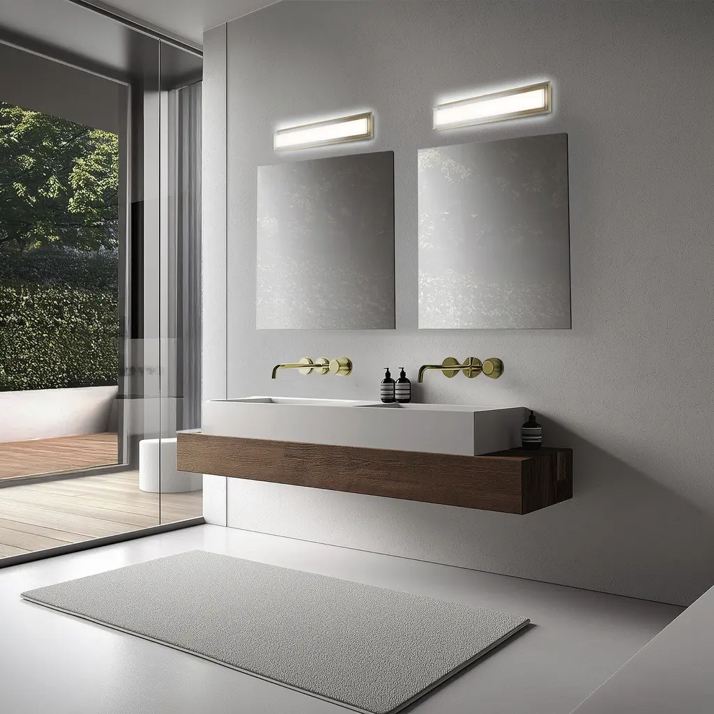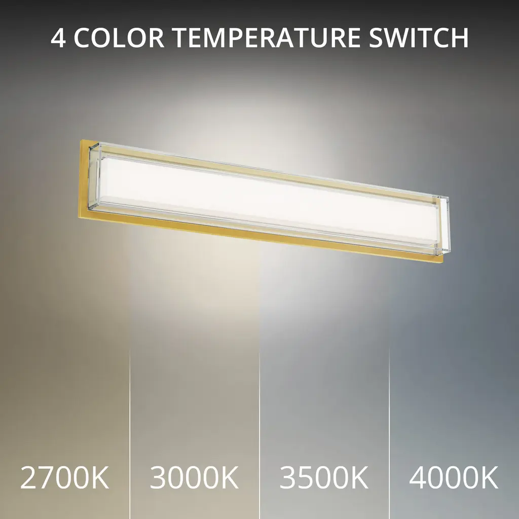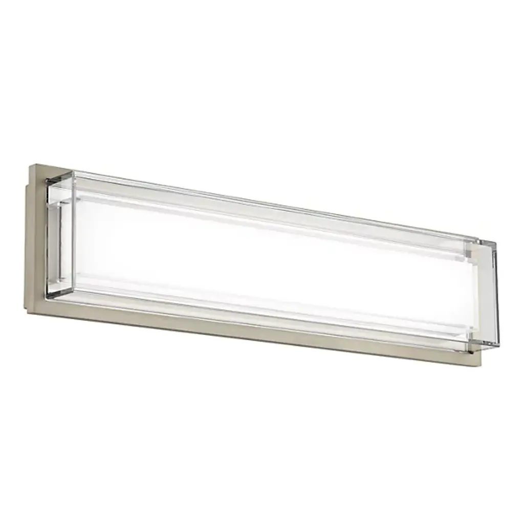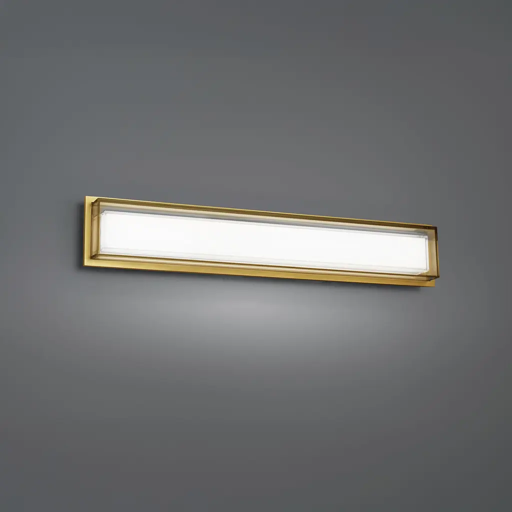 Frozen. The Ice Bar bath vanity light showcases a substantial gleaming backplate behind a clear glass shade. The etched glass interior adds texture, creating a glowing rectangle of soft illumination from concealed, color temperature adjustable LEDs. Offered in 20, 28 and 38-inch sizes, Ice Bar is available in both aged brass and brushed nickel finishes.