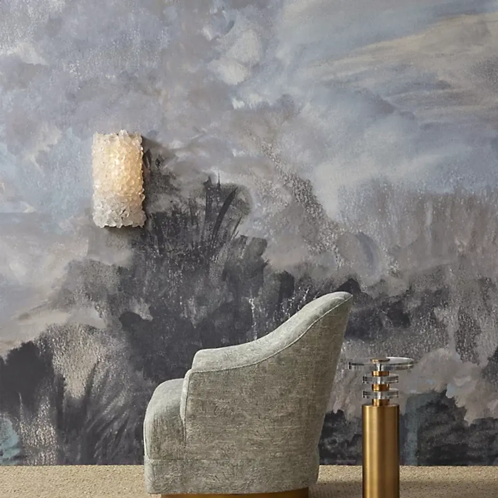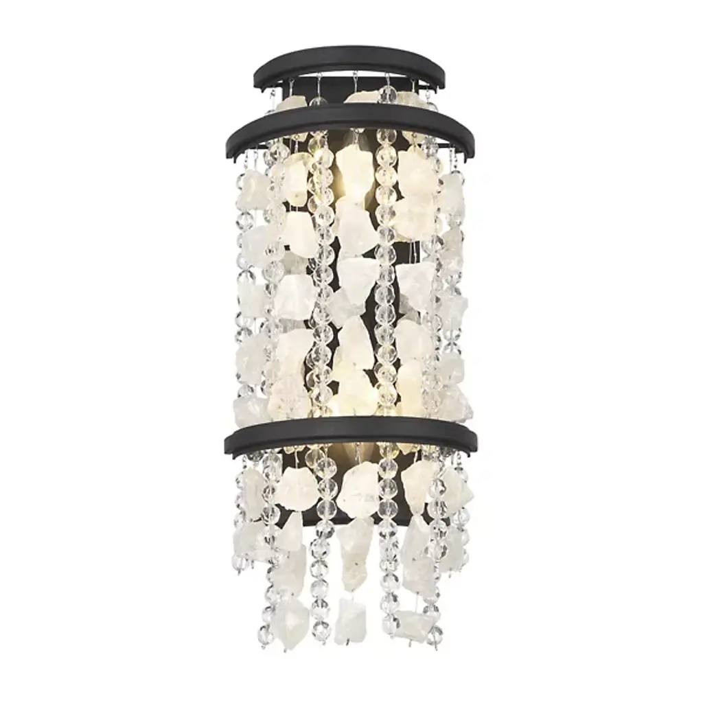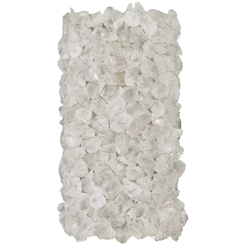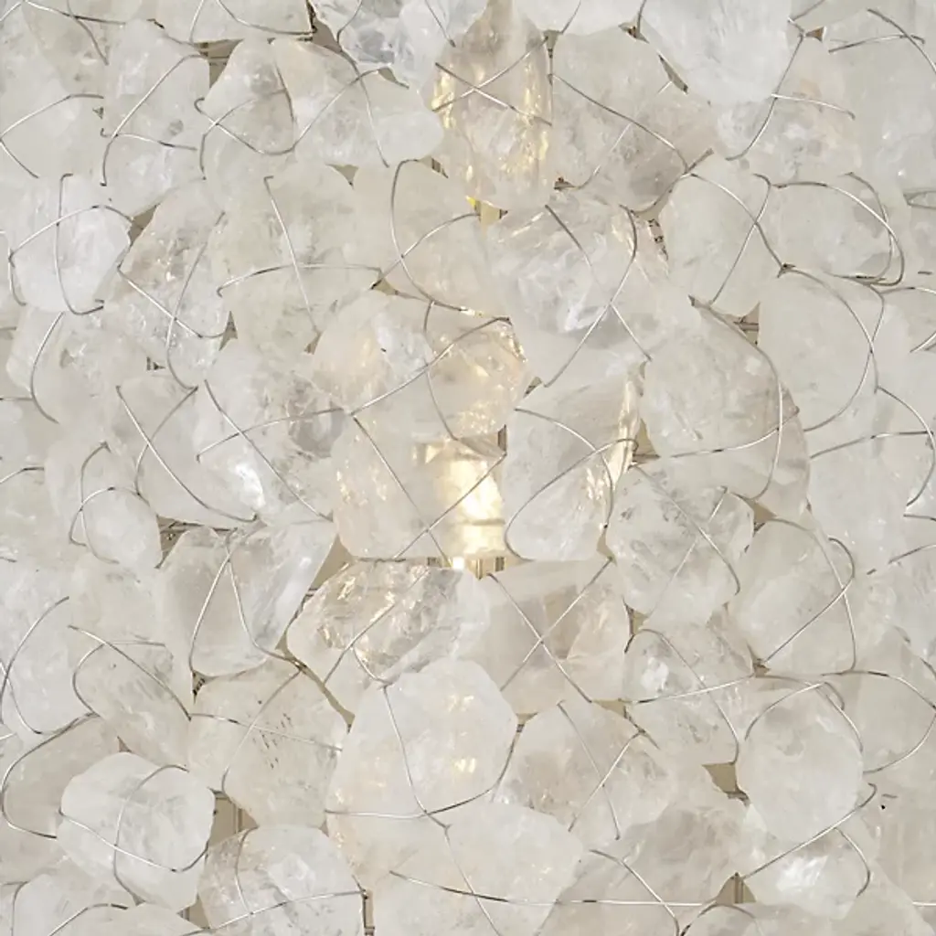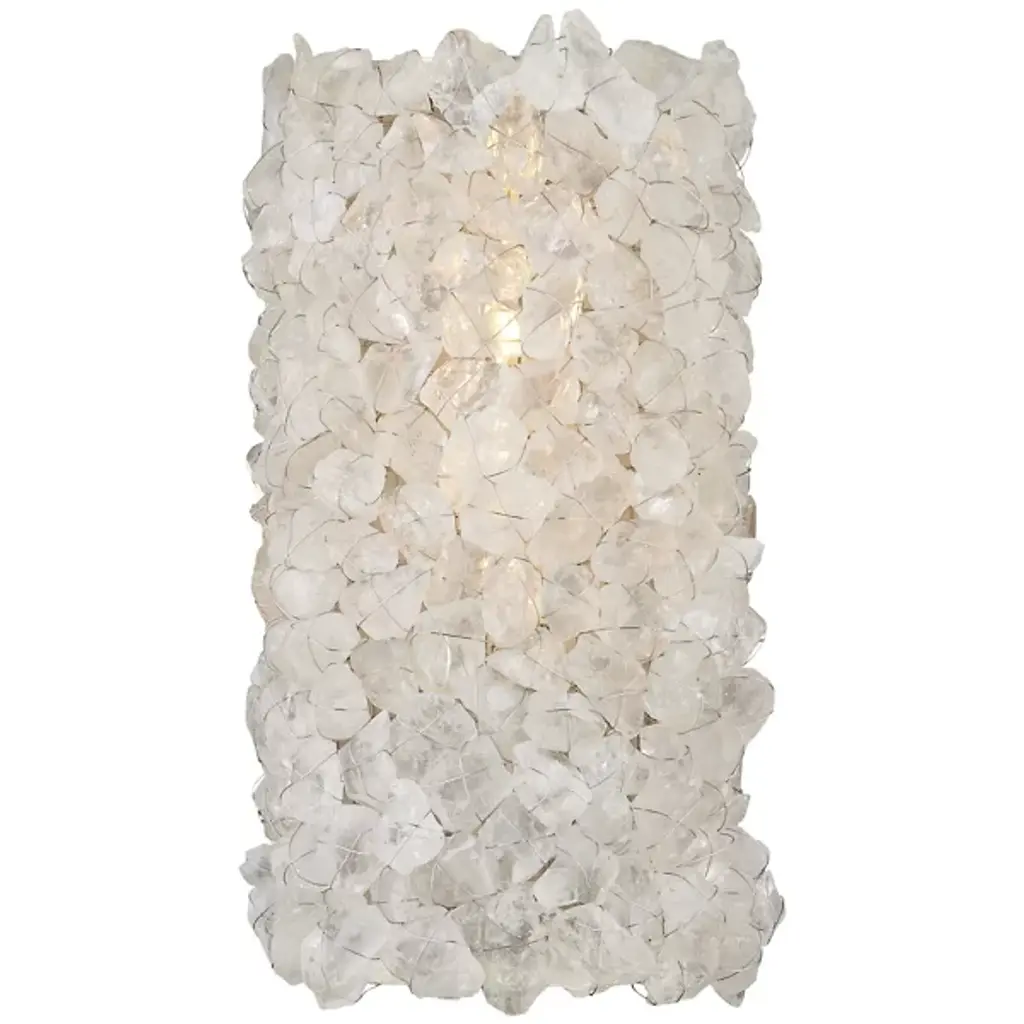 The Iconoclast Wall Sconce from Currey & Company is a stunning piece adorned with natural rock crystal on a sturdy wrought iron frame finished in contemporary silver leaf. This white wall sconce is meticulously crafted, with rock crystals delicately attached using thin wire to enhance visual interest without compromising their luminosity. The translucent crystals filter light like ice, adding a captivating glow and enhancing the fixture's exquisite beauty. Ideal for adding a touch of elegance and sophistication to any space.