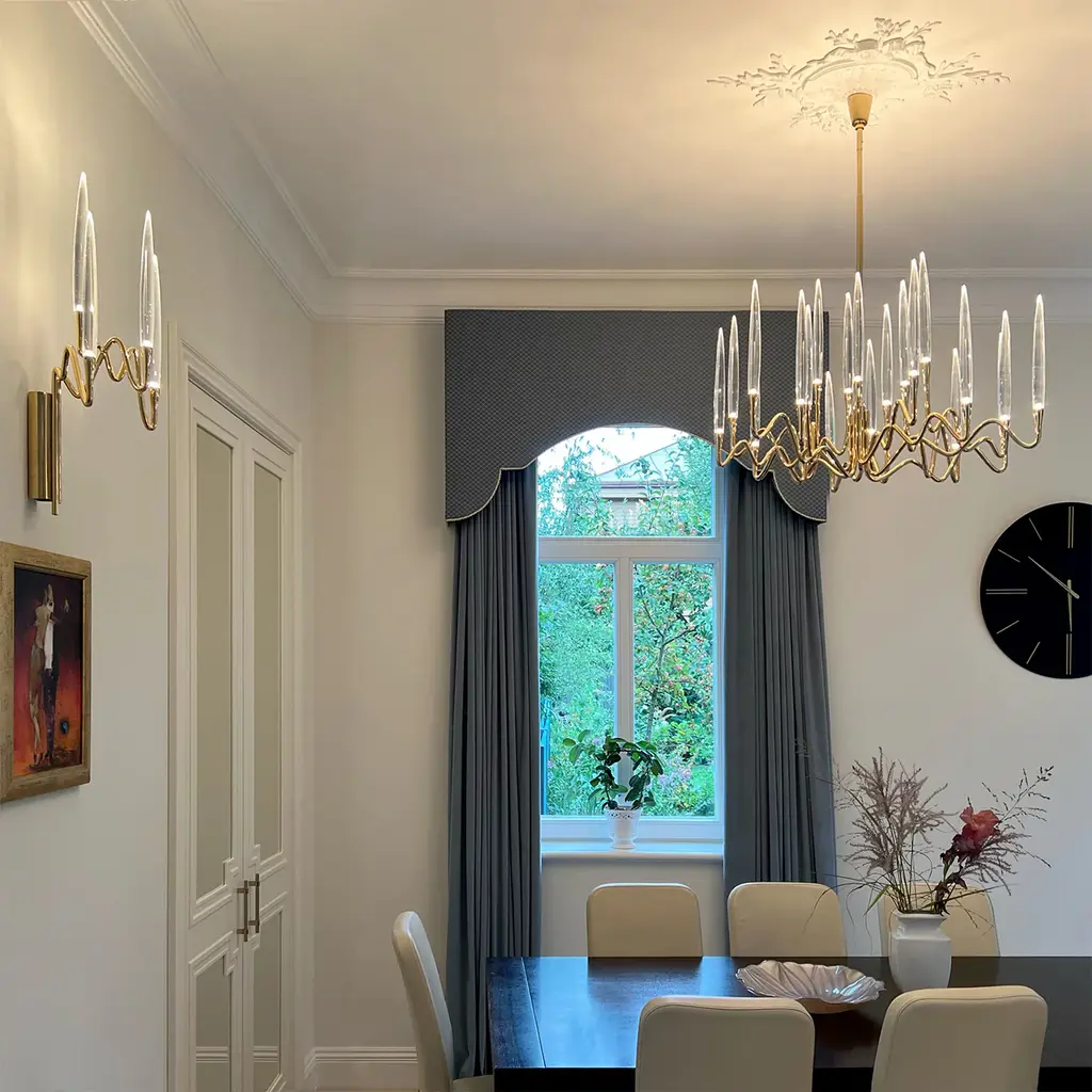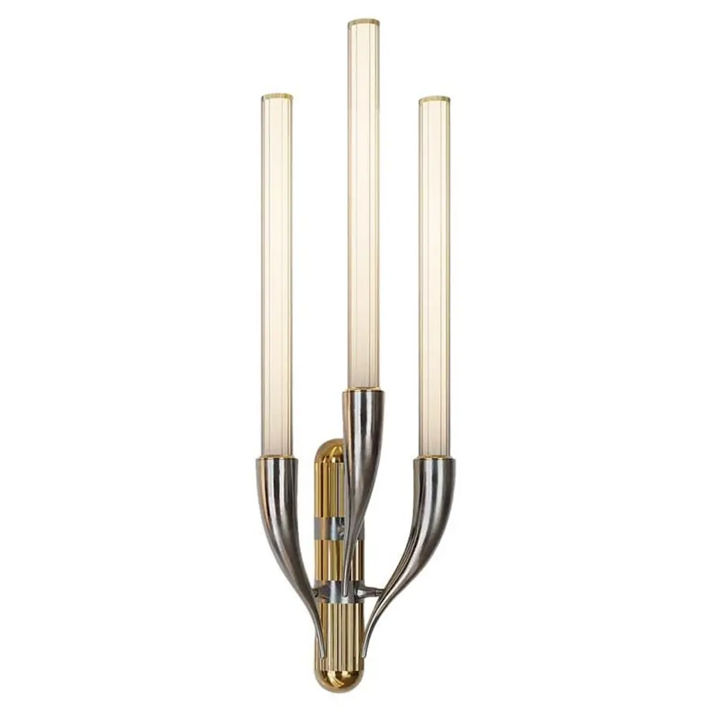 Il Pezzo 3 Wall Sconce, designed by Cosimo Terzani and Barbara Bertocci, draws inspiration from Arabic calligraphy and classic candelabra design. Featuring a gold finish, hand-forged brass, and solid crystal “candles”, it utilizes dimmable LED technology. The piece includes a unique brass “Missing Piece” for authenticity. Available finishes include gold, nickel, bronze and satin brass. Customization is available, please contact the concierge.