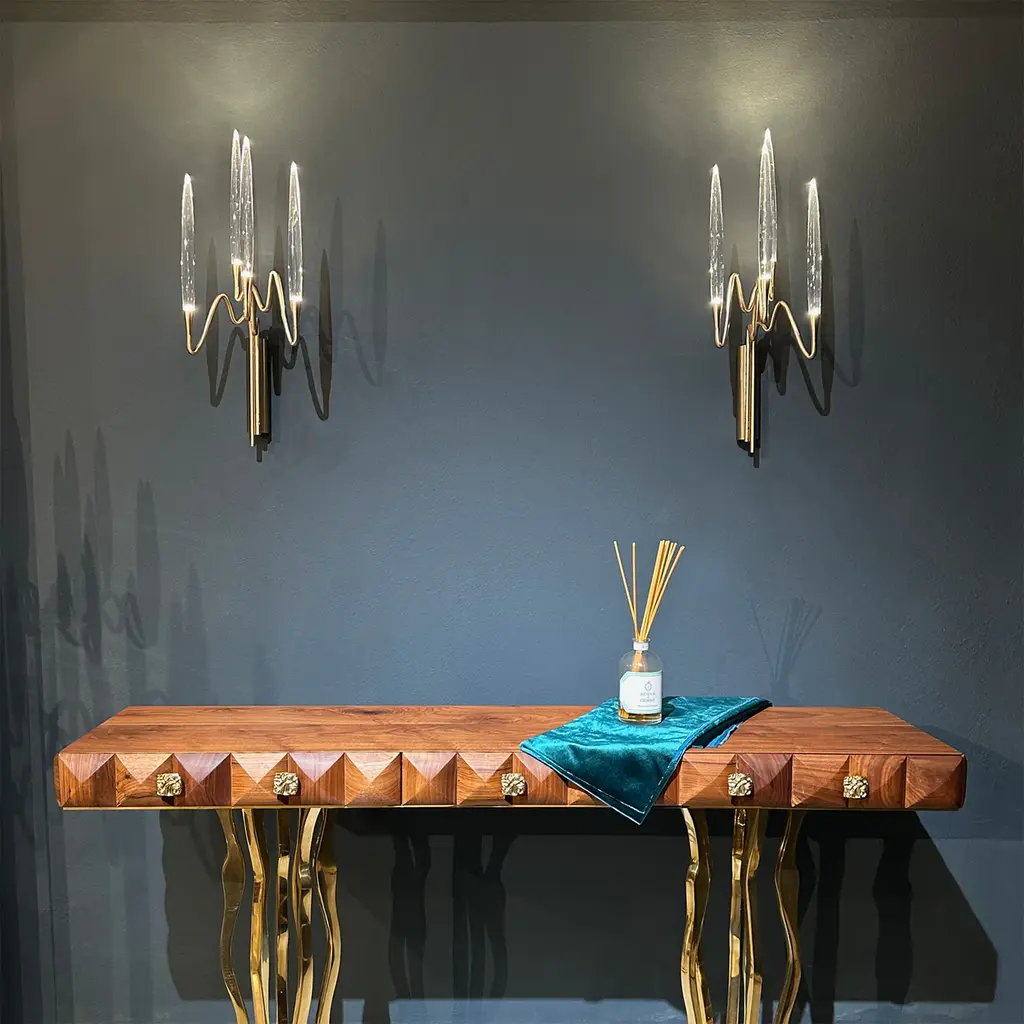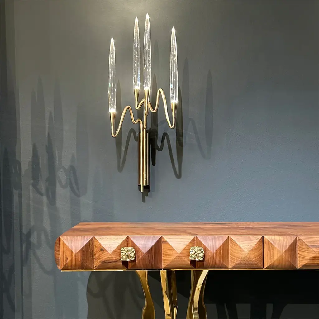 Il Pezzo 3 Wall Sconce, designed by Cosimo Terzani and Barbara Bertocci, draws inspiration from Arabic calligraphy and classic candelabra design. Featuring a satin brass finish, hand-forged brass, and solid crystal “candles”, it utilizes dimmable LED technology. The piece includes a unique brass “Missing Piece” for authenticity. Available finishes include gold, nickel, bronze and satin brass. Customization is available, please contact the concierge.