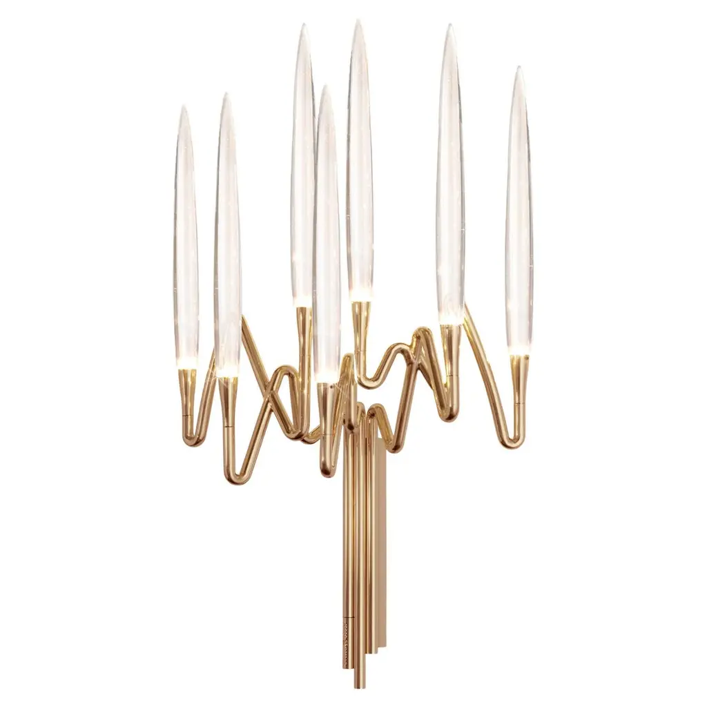Il Pezzo 3 Wall Sconce designed by Cosimo Terzani and Barbara Bertocci, draws from Arabic calligraphy and classic candelabra design. It features hand-forged brass and solid crystal “candles” crafted in Florence. With dimmable LED technology, the piece includes a unique brass “Missing Piece” with a serial number for authenticity. It is available in finishes include gold, nickel, bronze and satin brass. Customization available, please contact the concierge for details.