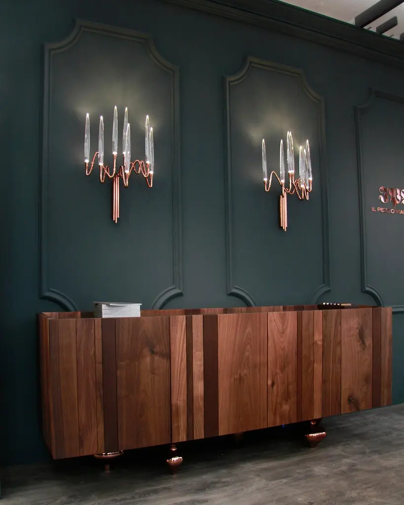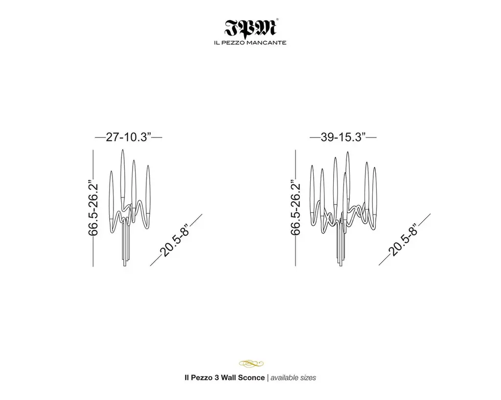 Inspired by Arabic calligraphic art and the icon of the classical candelabrum is Il Pezzo 3, a collection of lamps with a hand-forged brass structure and elegant “candles” crafted from hand blown crystal, according to the noble Tuscan artisan tradition. The candles are illuminated using the latest LED technology, creating a sophisticated and romantic light. Experiencing the exquisite craftsmanship of this piece, combined with highly advanced technology, is truly fascinating.Notably, the lamp features a distinctive element, its “Missing Piece”(“Pezzo Mancante” in Italian): a small brass cylinder containing the serial number, guaranteeing its authenticity and individuality.Custom finishes are also available to suit every preference.All our masterpieces are meticulously crafted in our Atelier located in Florence, Italy, from a small team of people driven by a shared passion for quality and beauty. We constantly strive to create unparalleled works of art, where each piece is a testament to our commitment to craftsmanship and innovation.Structure: hand-carved brassFinish: nickelDiffusers: solid crystalLight source: 2.700K LED, CRI>90.Size: 27x20,5xH66,5 cm - 10.3"x8"xH26.2"ETL certified UL and CSA standards compliant.