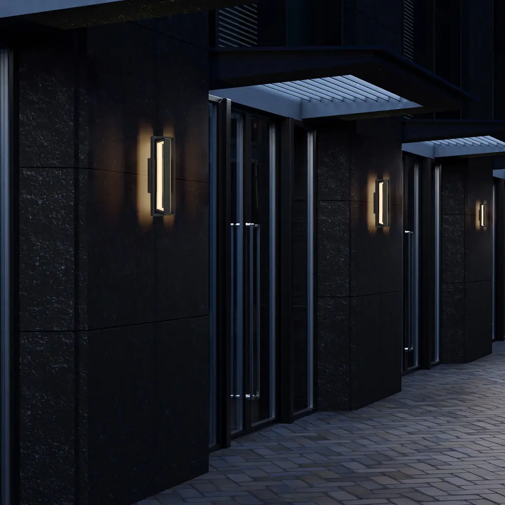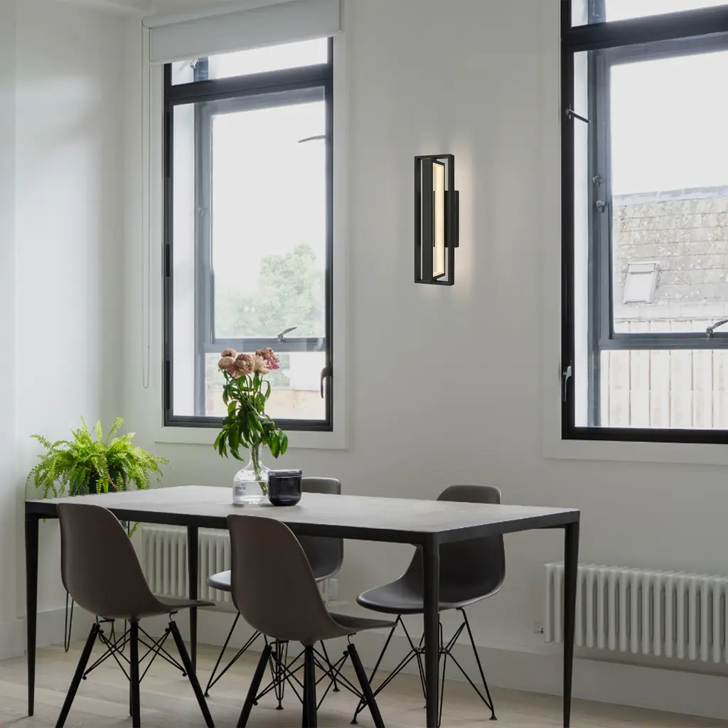 The In & Out Wall Sconce features a sleek, modern design with intersecting rectangles, blending geometric precision with sophistication. Wet location listed, its perfect for both indoor and outdoor use, making it ideal for commercial and residential spaces. Whether lighting corridors, lobbies, patios, or living rooms, this sconce delivers stylish ambient illumination with a bold visual impact.