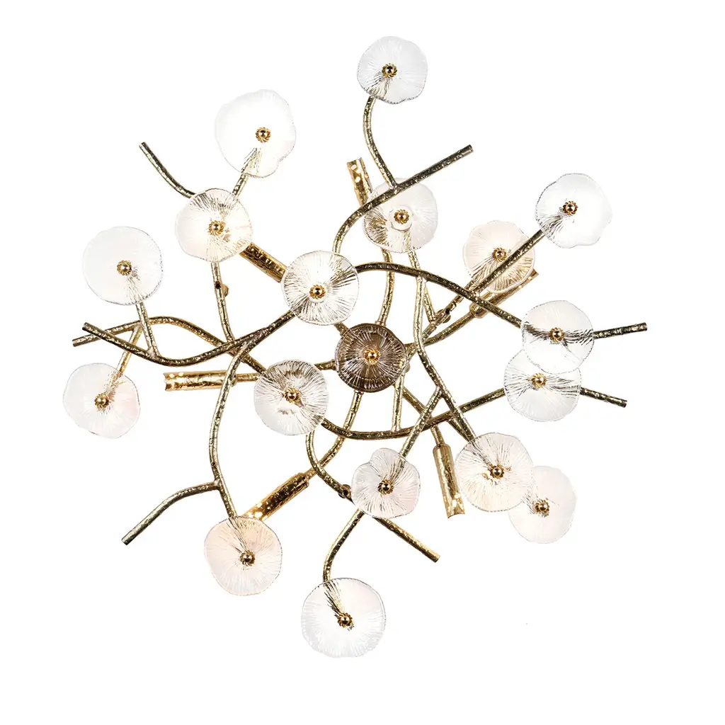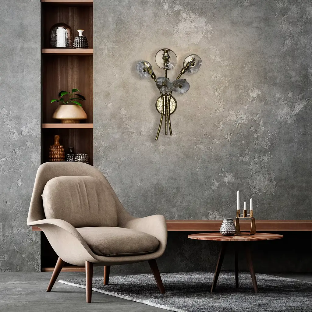 A celebration of nature and craftsmanship, this refined wall lamp draws inspiration from a bundle of blossoming flowers. Minutely mouth-blown, the bud-like glass shades top elegant curved arms in hammered brass that recreate graceful stems. Please explore the Artemest catalog for ceiling versions, allowing for a poetic and coherent look.