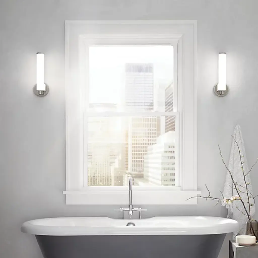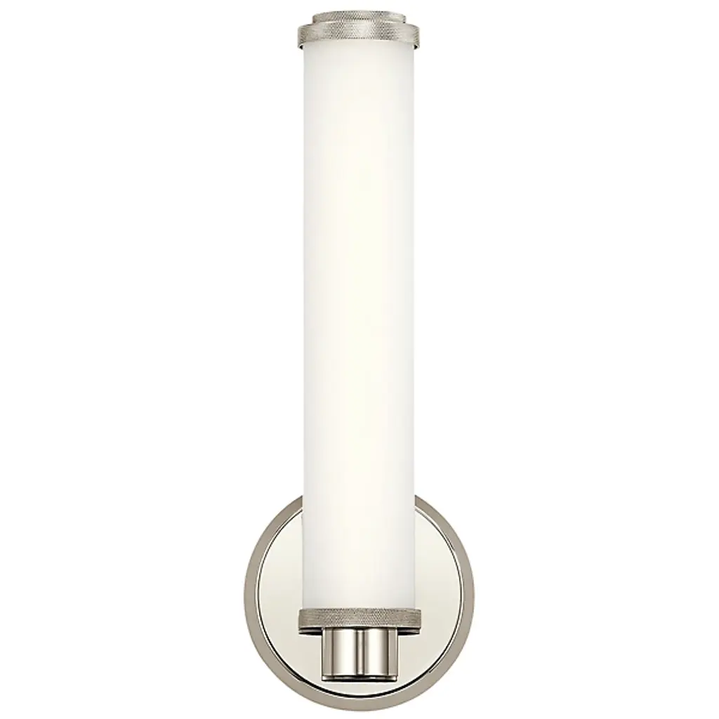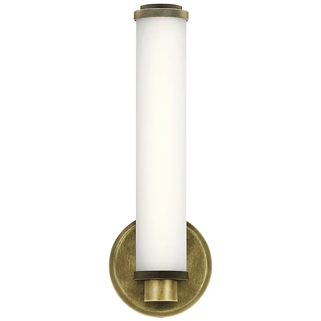 The Indeco LED Wall Sconce by Kichler is held to wall by a circular frame, which is available in both Natural Brass and Polished Nickel. The shade is a cylindrical piece of Satin Etched White glass that is an efficient light diffuser, spreading radiance in all directions. Bring a dash of class into your bath space with this elegant wall sconce.