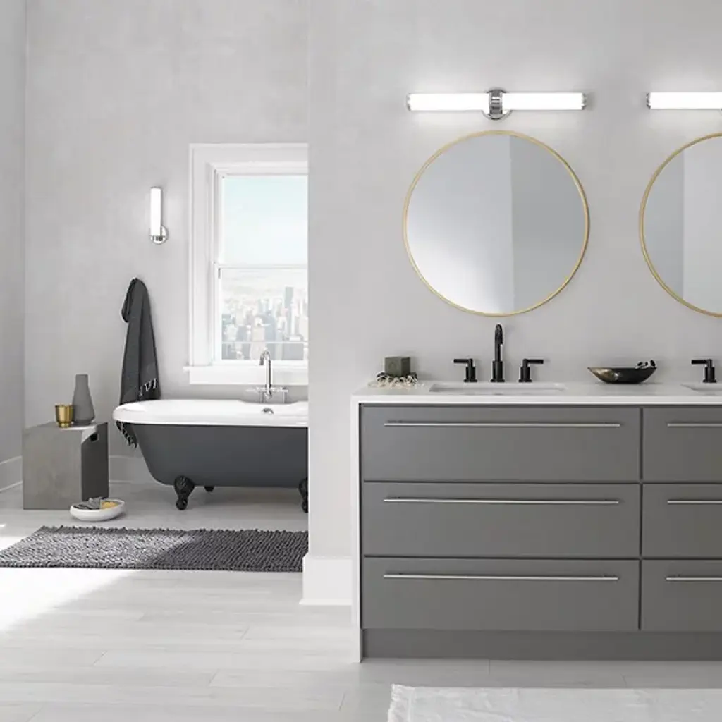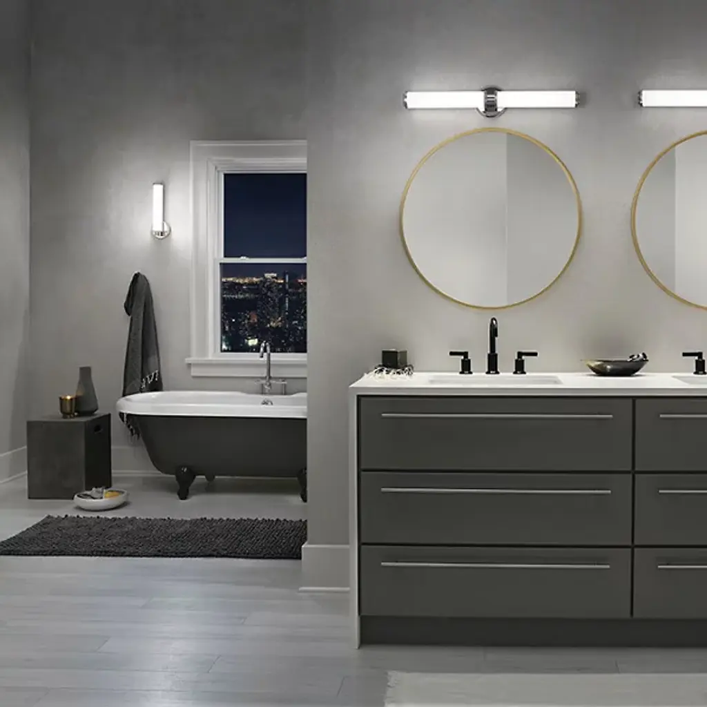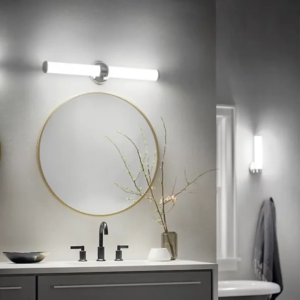 The Indeco LED Wall Sconce by Kichler is held to wall by a circular frame, which is available in both Natural Brass and Polished Nickel. The shade is a cylindrical piece of Satin Etched White glass that is an efficient light diffuser, spreading radiance in all directions. Bring a dash of class into your bath space with this elegant wall sconce.
