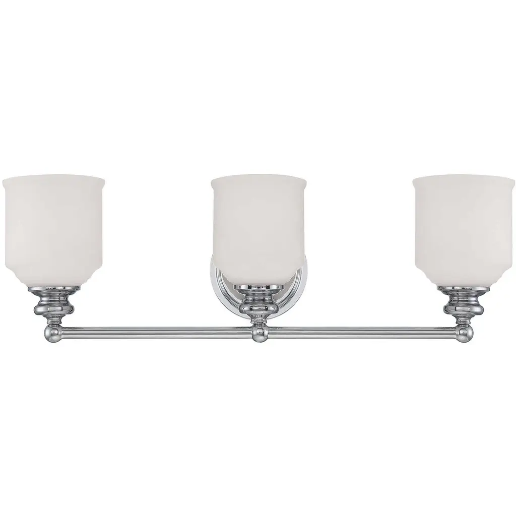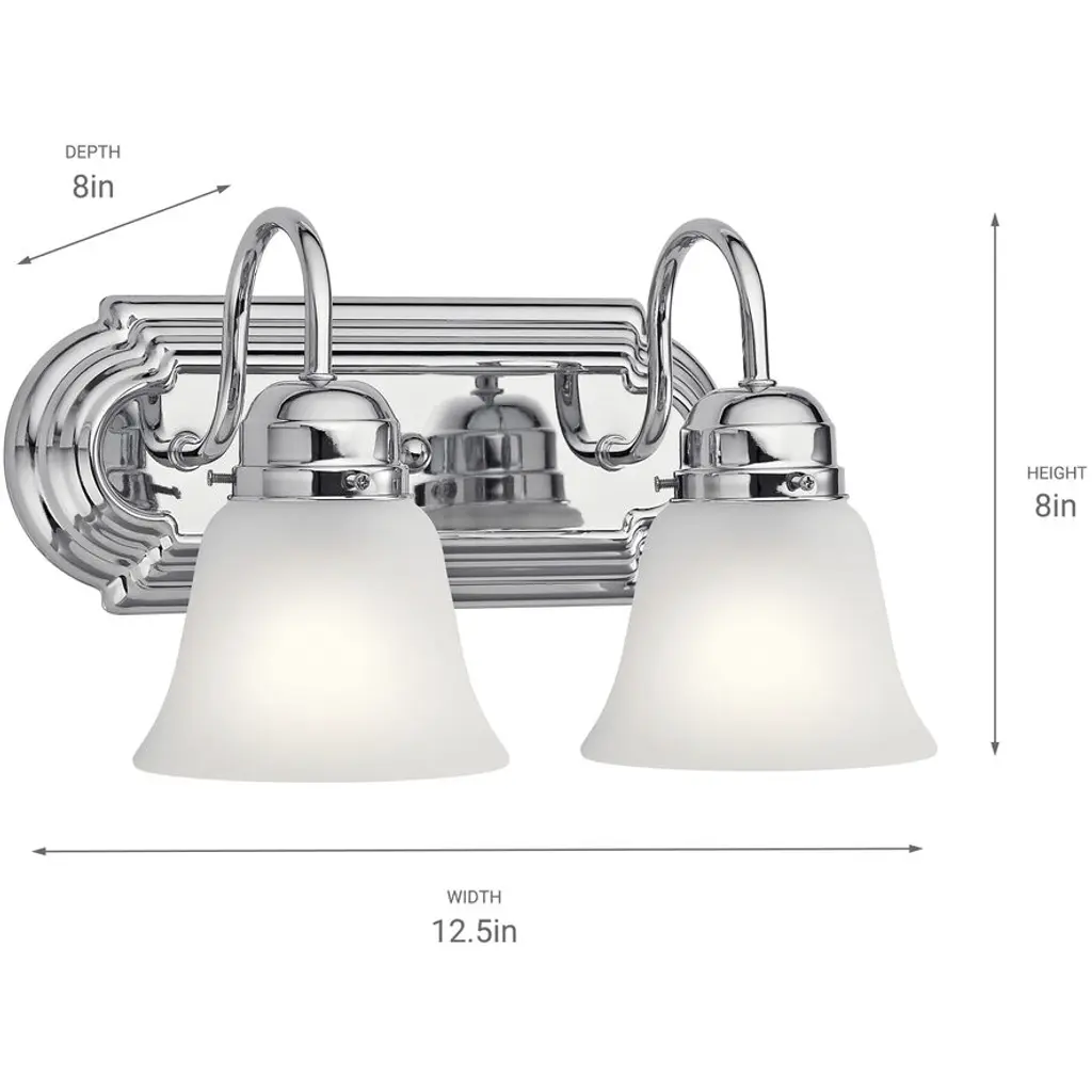 The modern lines of this 12.25in. 2-light bath light fixture in a Chrome finish with Satin Etched glass will blend into many decors.