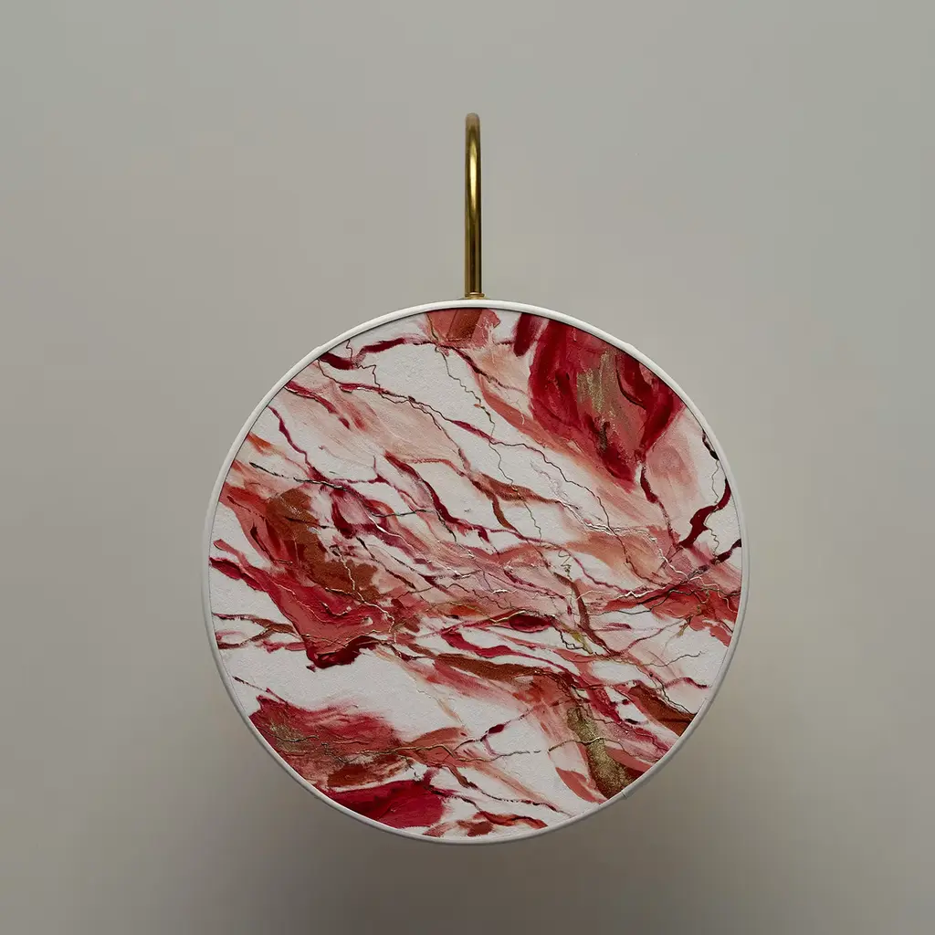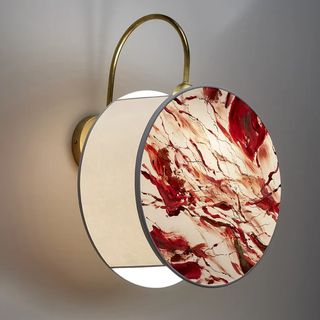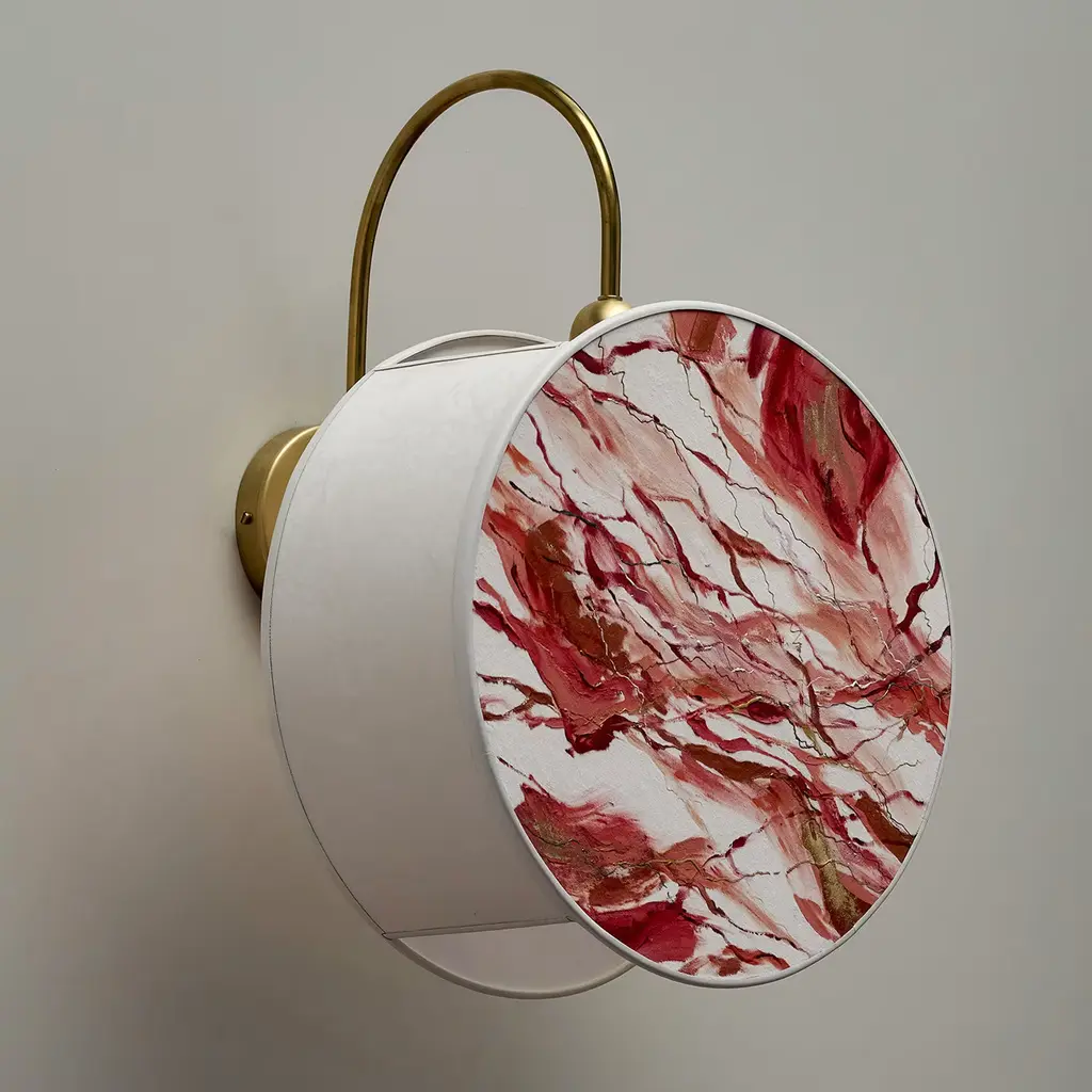 The velvet base of this exquisite lampshade accentuates the stucco relief in every color detail. Light enhances the nuances and the preciousness of ivory velvet completes the elegant look. The front facade of the Indian Red Lampshade is entirely hand-painted with infinite gradations in coral pink and Indian red veins, small gray and black golden threads with dull gold streaks.