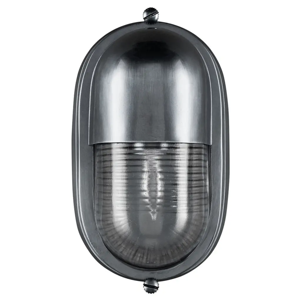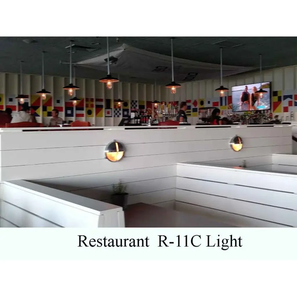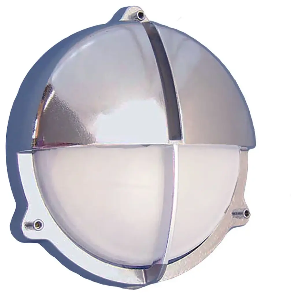 Industrial Chrome Finish (more textured, rugged finish - contact us for more detailed info/images) / Interior (Dry) UseOur R-11 combines nautical and industrial details to create a modern / industrial sconce with a little extra art deco flair. True to our roots, we preserved nautical durability and added extra design. The result is a solid brass UL wet rated round bulkhead sconce that can be used both inside and outside the home.R-11 Additional details include:Solid Brass (10+ Finishes Available)UL Listed, Suitable for Wet Location; Interior / Exterior Residential & Commercial use.Max Wattage: 100w LED; Wall -75w Ceiling -60w Incandescent; Medium Base Sockets (E26) accepts LEDs, Incandescent, CFLs; Standard 110v , DimmableAssembled & UL Listed by our team of dedicated craftsmen & women in Marblehead, MA (USA)Options: On/Off Switch Available; Oval Versions Available (O-5,6,7)Glass: Clear & Frosted GlassFinishes: Standard Finishes: Unlacquered Brass, Industrial Chrome, Polished Chrome ; Custom Finishes: Antique Brass, Antique Copper, Antique Nickel, Oil Rubbed Bronze, Pewter, Polished Copper, Polished Nickel, Satin Brass, Satin Copper, Satin Nickel, Verdi & Powder CoatMaintenance: Lights will patina and eventually verdigris overtime. Since our lights are solid brass, they will not rust or corrode.Installation: 6” Mounting Surface, attaches to standard box; Wires exit through back of fixture. All Installation Hardware Provided. Alternative Mounting Options available upon request. No assembly requiredInstallations of our Modern Industrial Round Bulkhead Sconce (also known as a half moon or clam shell wall mount) included the Blue Fin Restaurant in Times Square, and private projects in Naperville IL, Bristol RI and East Sound WA.- **What MAKES our Light different than similar looking products: We modify the base so it will attach and cover a standard junction box. All our lights come with hardware so they're easy to install. IF you've been stuck with a similar looking light and have no idea how to mount it, look no further than our nautical lighting solutions. We promise our lights will be easy to install and will hardwire though the back of the fixture directly into the j-box. Alternative mounting options are available upon request.**Shiplights specializes in nautical inspired Interior / Exterior UL Listed lighting for Residential & Commercial use. Our durable solid brass lighting is typically available in over ten finishes ranging from unlacquered brass to chrome to satin nickel, oil rubbed bronze, powder coat and more. Our fixtures can be used in all locations inside and outside the home. Their solid brass construction makes them ideal for use in humid and seaside locations. Our lights are all assembled & UL Listed by our team of dedicated craftsmen & women in Marblehead, MA (USA).