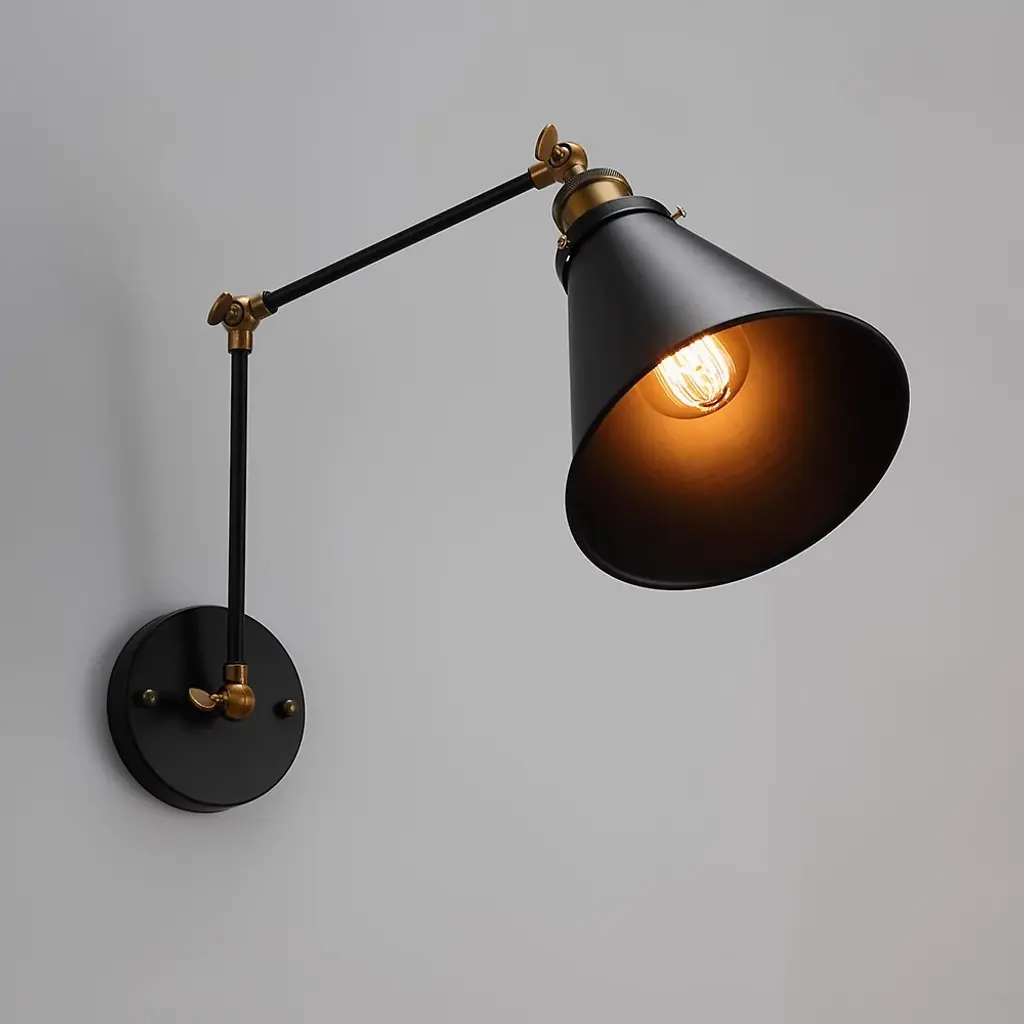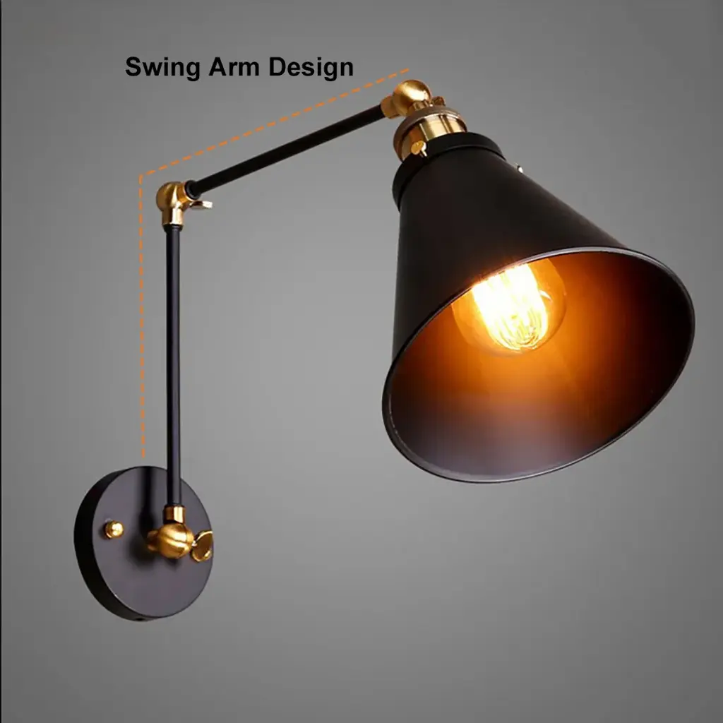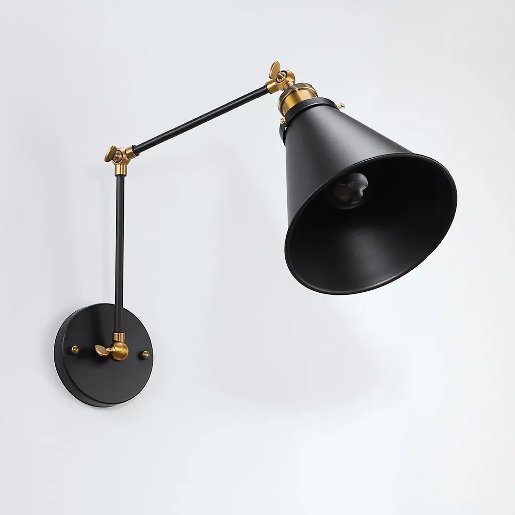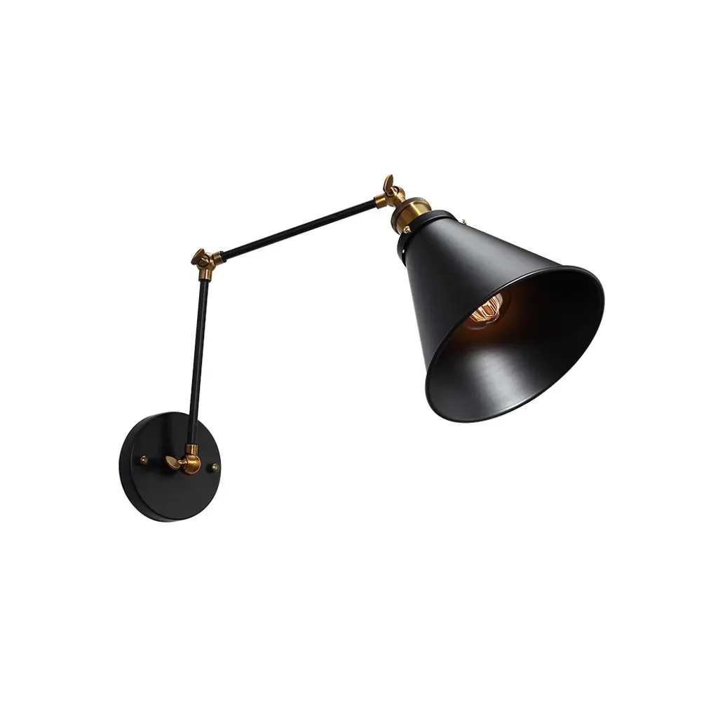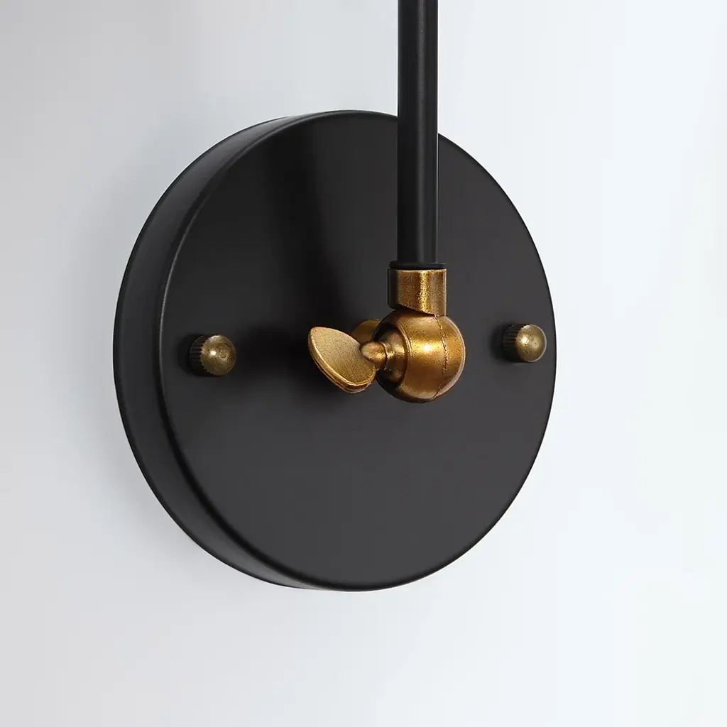 Carrying a touch of vintage flair, this industrial style inspired wall lamp casts a warm glow over any space from your bedside to home office. Handsome and functional, it features two swing arms that can be adjusted with up and down movements, allowing you to direct the light wherever you need it. With an understated black finish and accented with a splash of brass, this indoor sconce offers a striking industrial look. This cool design will be your right lighting solution!