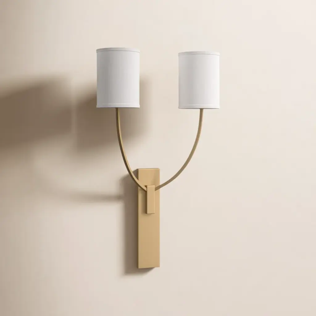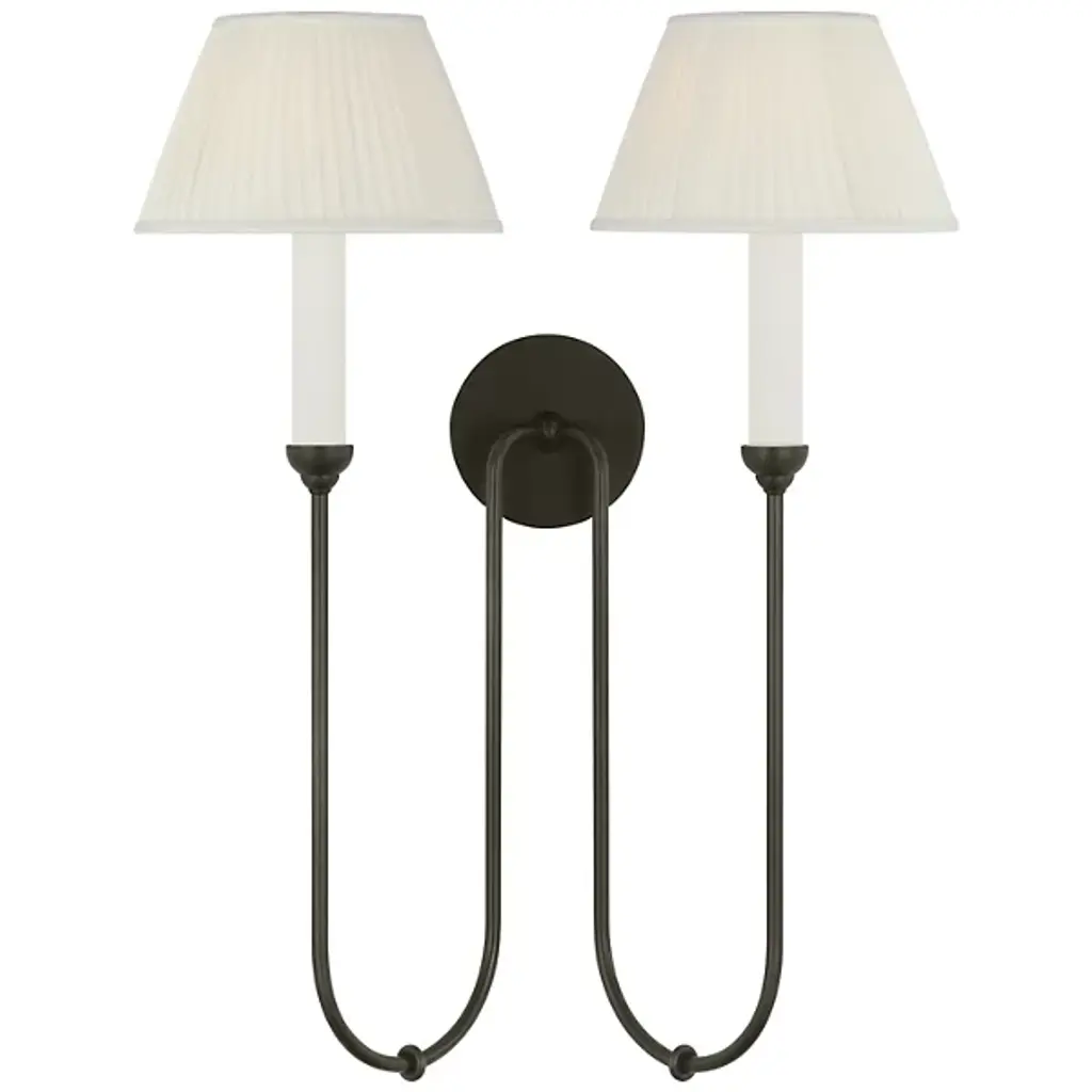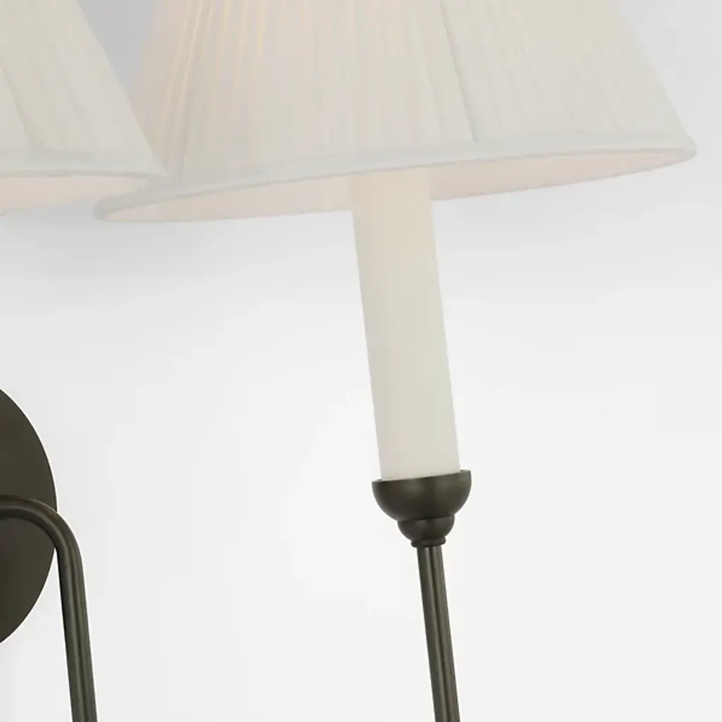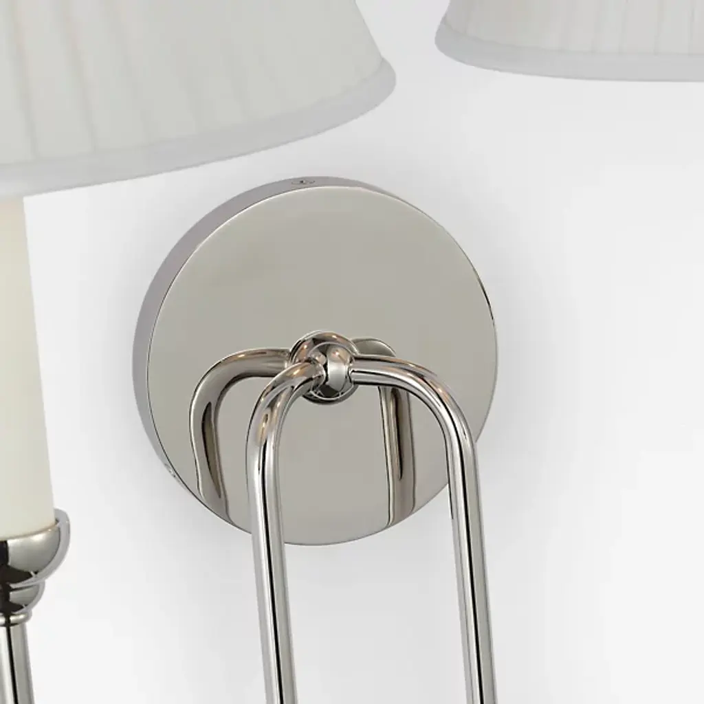 The Ingela Double Wall Sconce from Visual Comfort Signature adds attractive elegance with a playful twist. Designed by Amber Lewis, two looping metal arms extend gracefully from a circular steel wall plate, lifting damp-listed candelabra lamps crowned by refined silk pleat shades. The curving metal accents add a touch of vintage flair to its transitional style, while the soft, ambient glow through the shade combines with downlight to create a warm and inviting atmosphere.