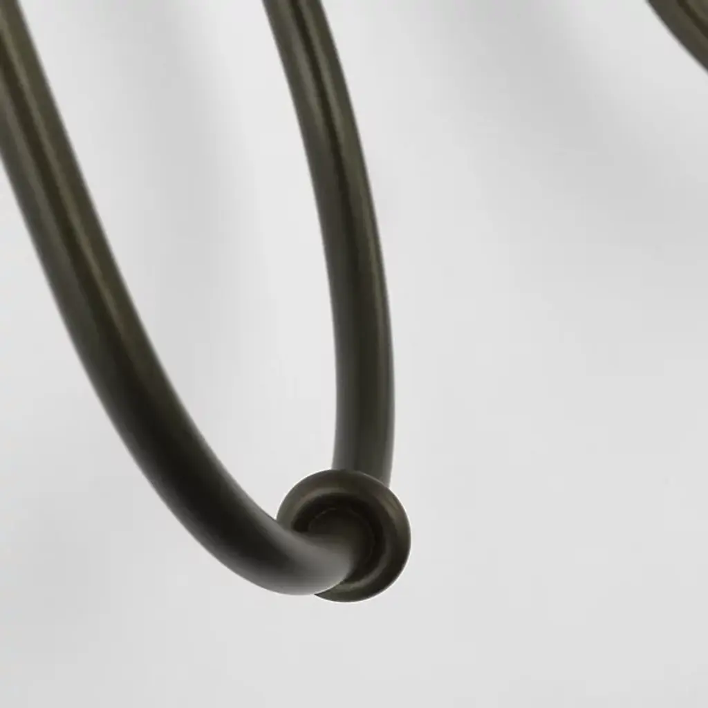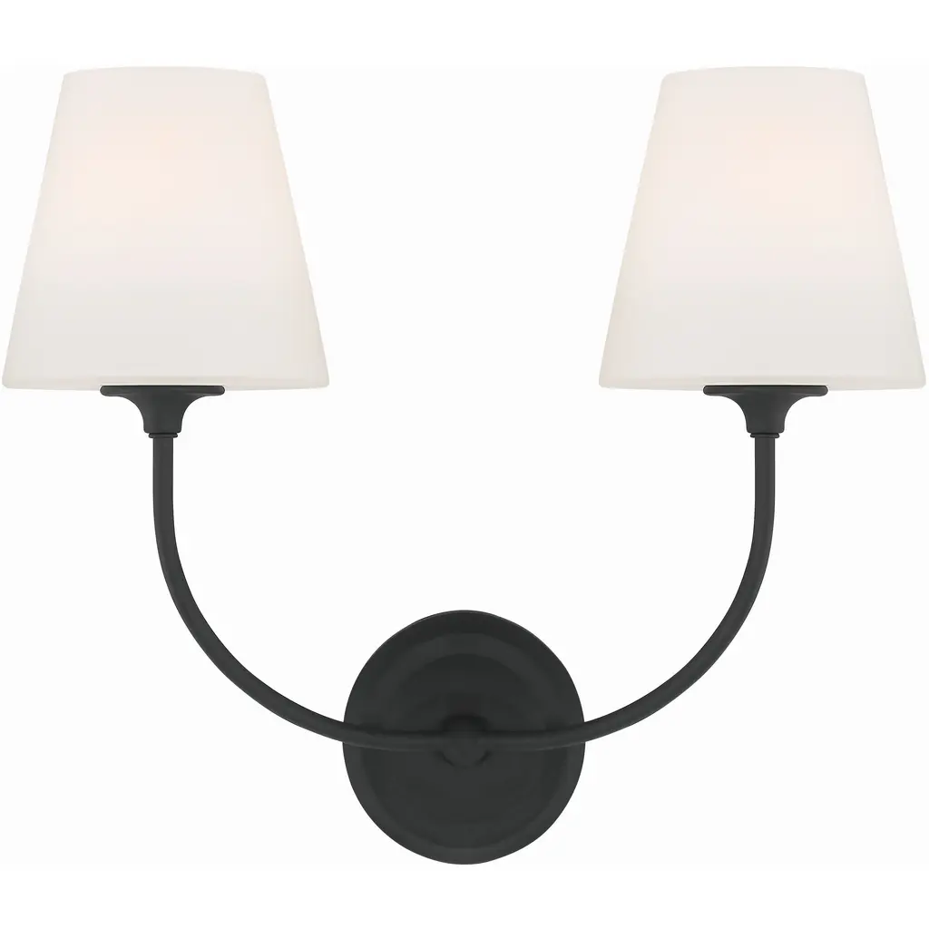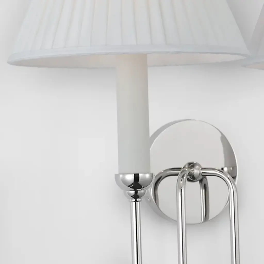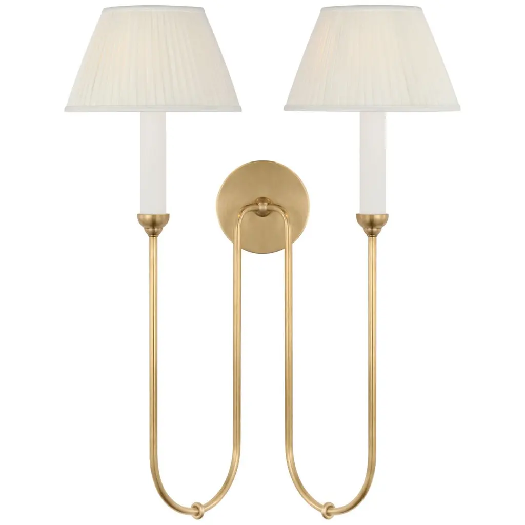 The Ingela Double Wall Sconce from Visual Comfort Signature adds attractive elegance with a playful twist. Designed by Amber Lewis, two looping metal arms extend gracefully from a circular steel wall plate, lifting damp-listed candelabra lamps crowned by refined silk pleat shades. The curving metal accents add a touch of vintage flair to its transitional style, while the soft, ambient glow through the shade combines with downlight to create a warm and inviting atmosphere.