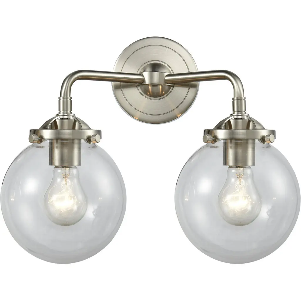 This armed sconce features a streamlined and minimalistic design that complements any space in your home. Shown with the clear glass shades, this wall sconce is versatile and can be placed in a bathroom,entry way, or hallway. Compatible with dimmers, so you'll have the right amount of light in any given time of the day. The hardwired fixture is safe to use in damp locations. Made from iron with a modern finish, it includes a round backplate and a matching arm that holds in place two 40W bulb ( sold separately). Available in multiple finishes. Can be installed as an uplight or a downlight.