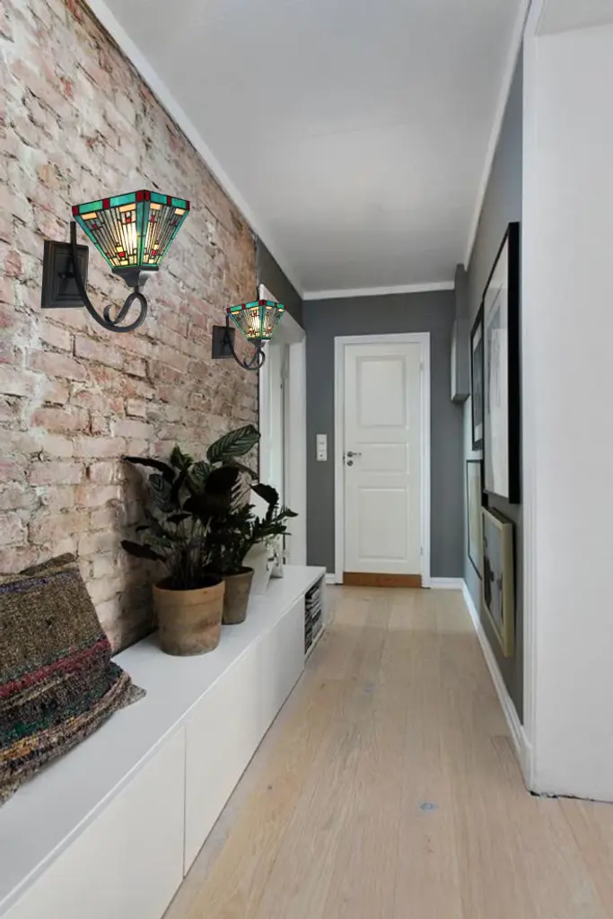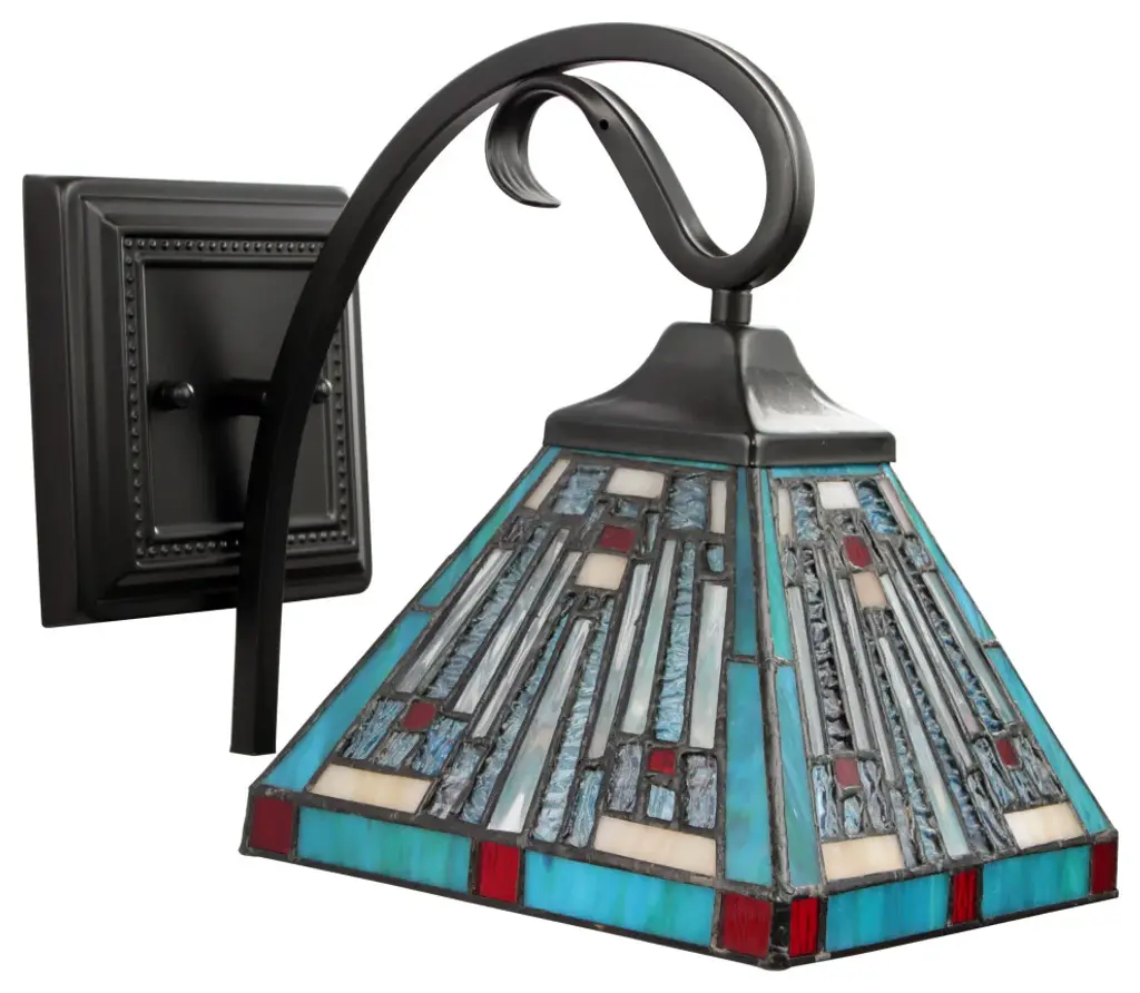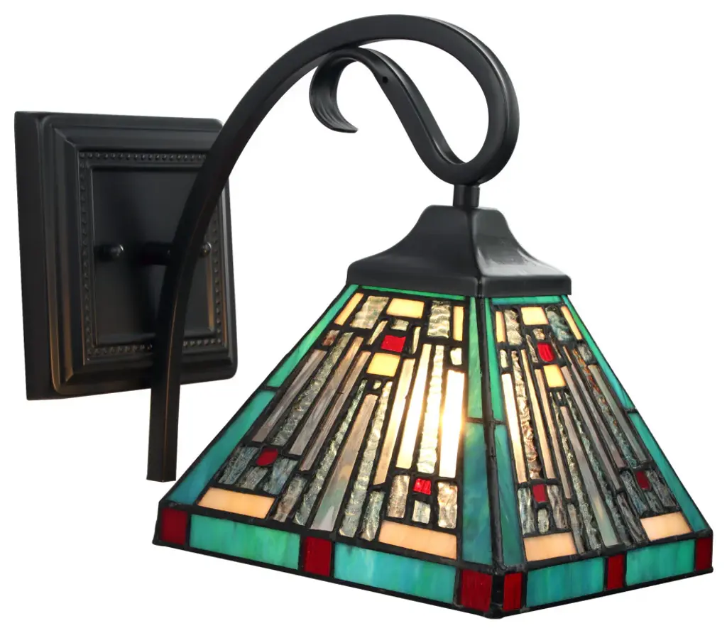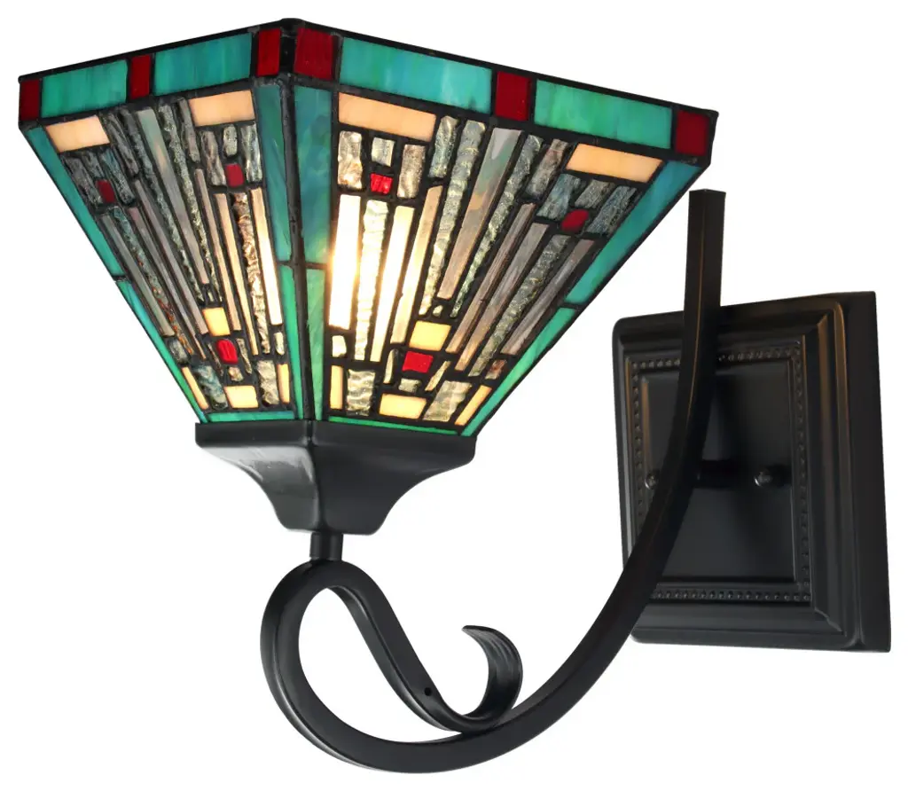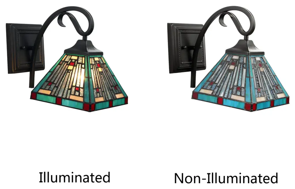 Innes is a stunning 1 light wall sconce, featuring a beautiful mission-design shade. This piece would be perfect in a hallway or even over a bed frame. Each shade is hand crafted, using the same methods developed by Louis Comfort Tiffany in the early 1900''s. This process entails using 184 hand cut stained art glass pieces, each wrapped in fine copper foil and soldered together at extremely high temperatures to form each unique piece. Exact size to the nearest inch may vary, and exact color of each glass piece may vary due to each piece being hand crafted. First image is with the light shining through, second image is with no light. Dry listed and recommended for an indoor setting.