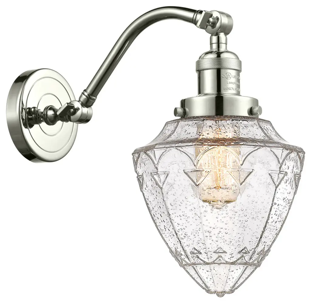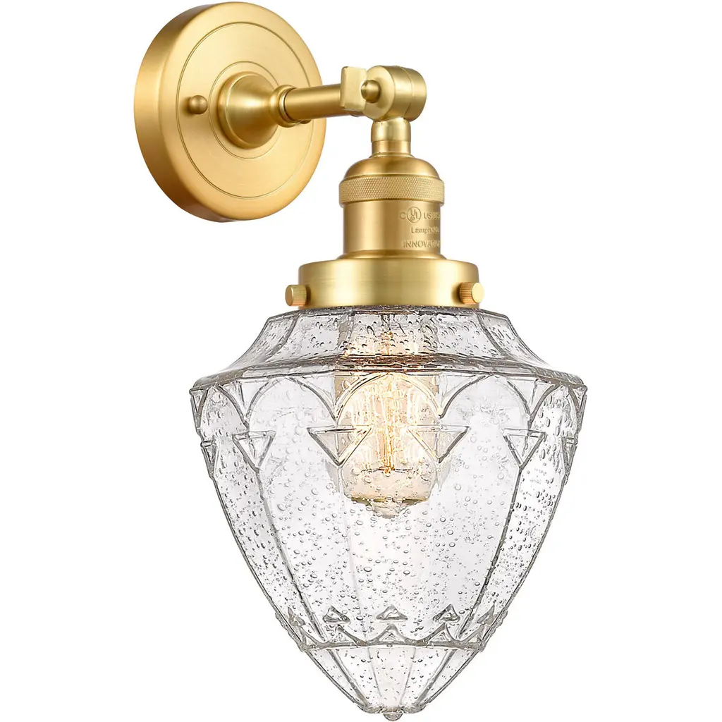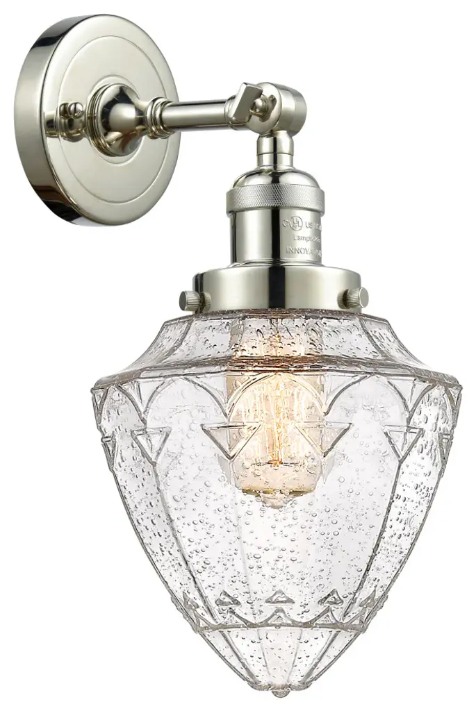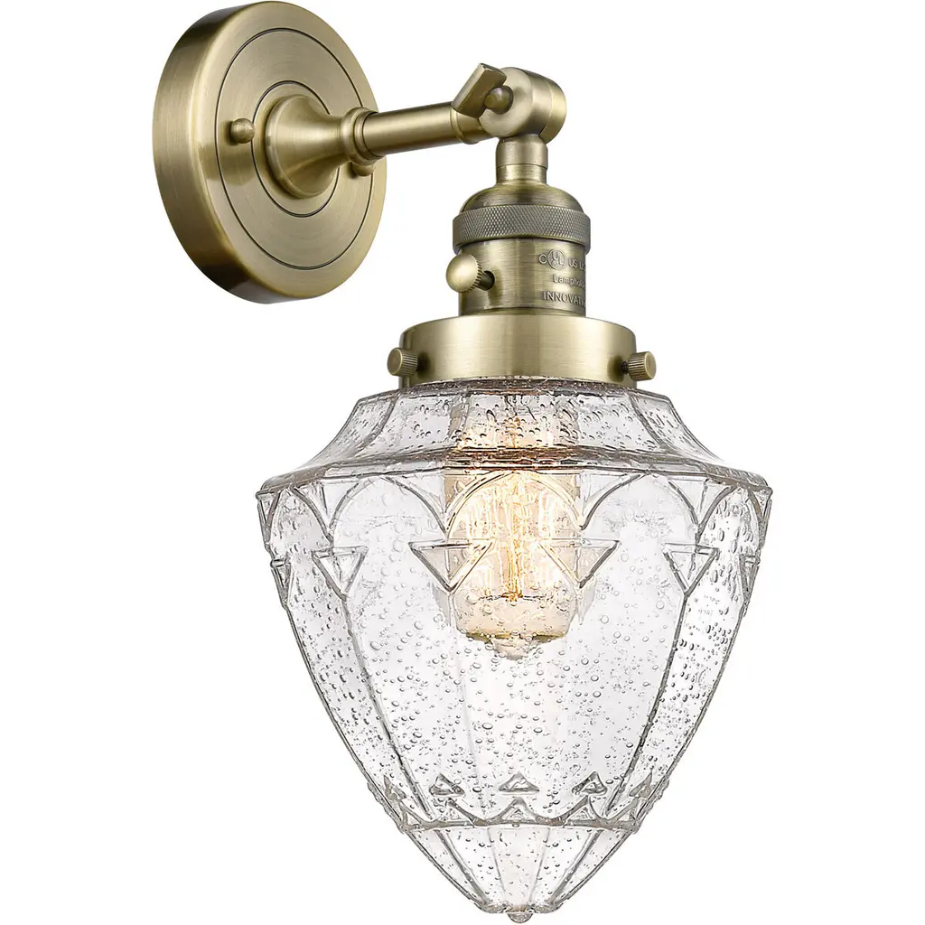 Innovations 203-AC-G664-7 Small Bullet 1 Light Sconce part of the Franklin Restoration Collection Antique Copper. Collection: Franklin Restoration. Style: Traditional, Art Deco. Metal Finish: Antique Copper. Metal Finish(Canopy/Backplate): Antique Copper. Material: Steel, Cast Brass, Glass. Dimensions(in): 15(H) x 7(W) x 8.625(Ext). Bulb: (1)60W Medium Base Incandescent(Not Included). Maximum Wattage Per Socket: 100. Voltage: 120. Dimmable: Yes. Color Temperature (Kelvin): 2200. Color Rendering Index (CRI): 99.9. Lumens: 220. Life Expectancy (Hours): 2000. Glass Shade Description: Seedy Small Bullet. Glass Type: Seeded. Shade Shape: Schoolhouse. Glass or Metal Shade Color: Seedy. Shade Material: Glass. Shade Dimensions(in): 7(W) x 8(H). Fitter Measurement (Glass or Metal Shade Fitter Size): 3.25 inch Fitter. Canopy Dimensions(in): 4.5(Dia). Backplate Dimenisons(in): 4.5(Dia) x 0.75(Depth). Mounting Center to Top: 2.25. Reversible (Can be hung with bulbs facing uo or down): Yes. Duo Mount: Yes. California Proposition 65 Warning Required: Yes. UL and ETL Certification: Damp Location.