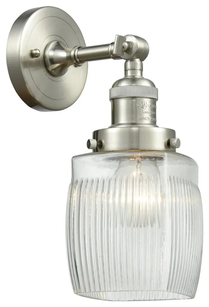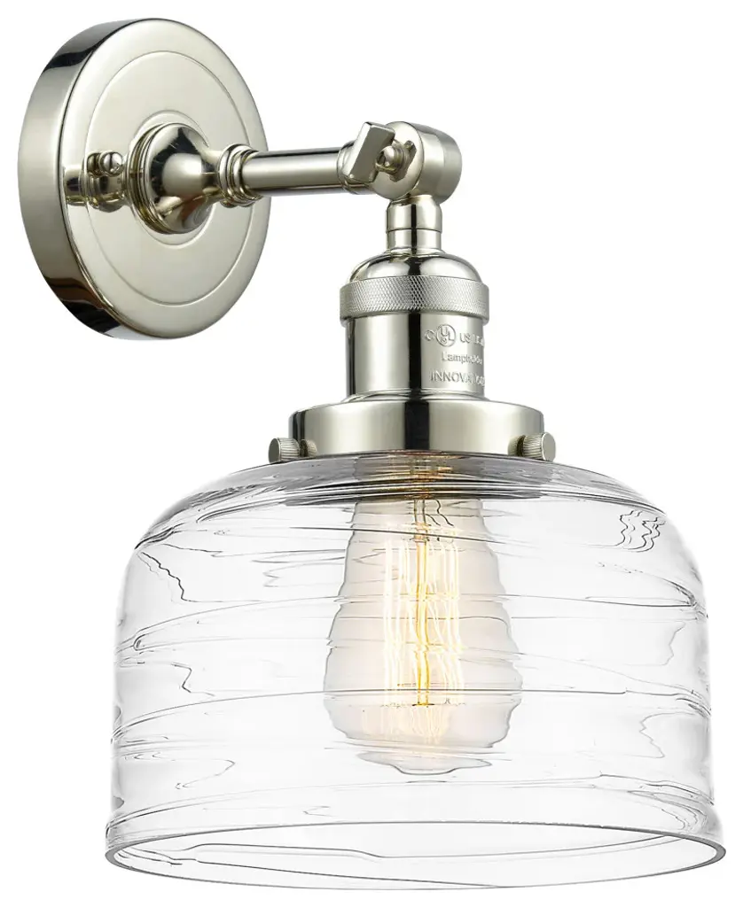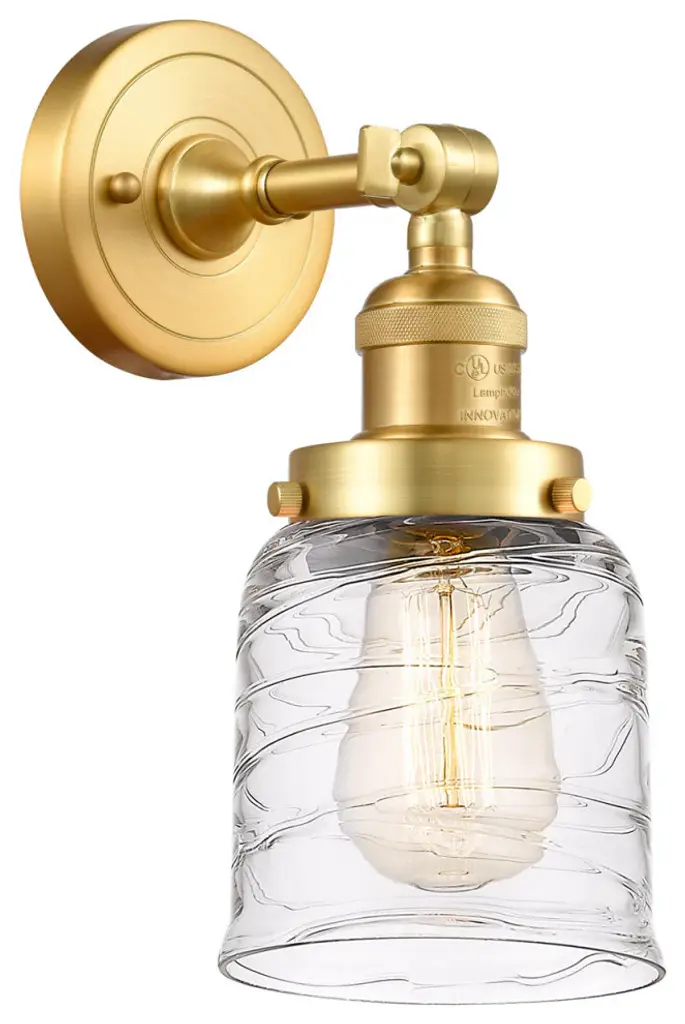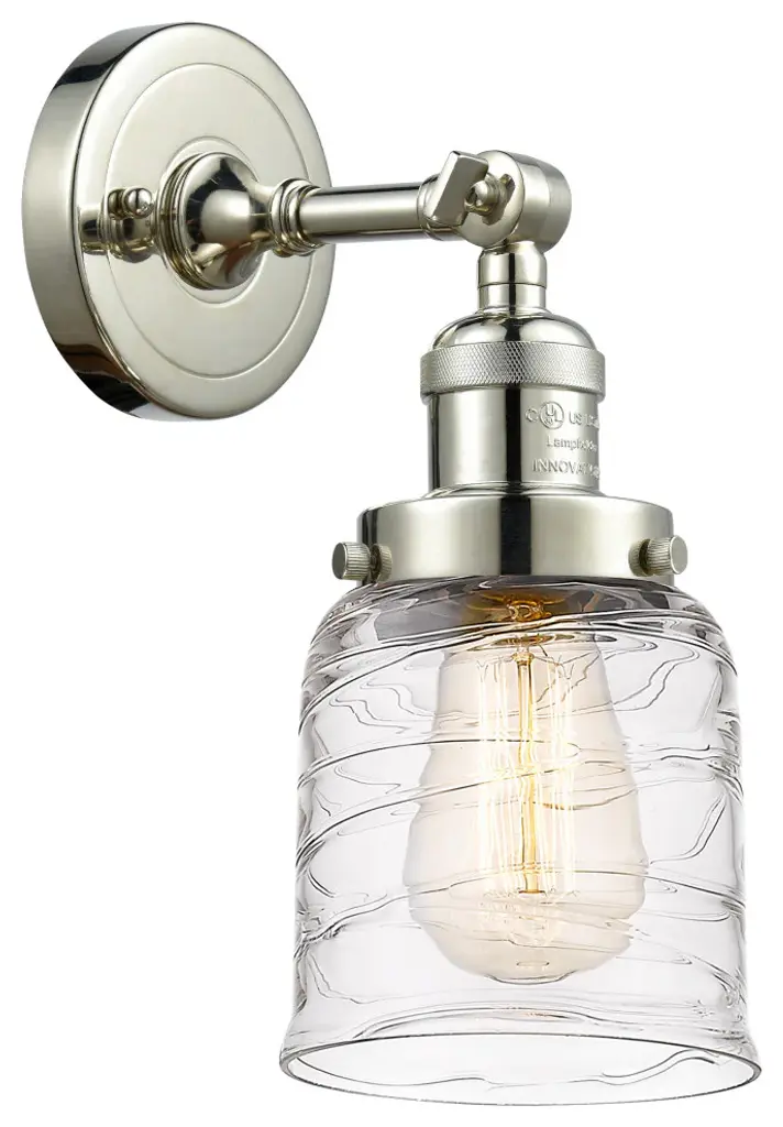 INNOVATIONS 203-PC-G513 1-Light Sconce Polished Chrome. Collection: Franklin Restoration. Style: Industrial, Farmhouse, Restoration-Vintage, Traditional. Metal Finish: Polished Chrome. Metal Finish (Canopy/Backplate): Polished Chrome. Material: Steel, Cast Brass, Glass. Dimension(in): 10(H) x 5(W) x 7(Ext). Bulb: (1)60W Medium Base,Dimmable(Not Included). Maximum Wattage Per Socket: 100. Voltage: 120. Color Temperature (Kelvin): 2200. CRI: 99. 9. Lumens: 220. Glass Shade Description: Clear Deco Swirl Small Bell. Glass or Metal Shade Color: Deco Swirl. Shade Material: Glass. Glass Type: Transparent. Shade Shape: Bell. Shade Dimension(in): 5(W) x 5. 75(H). Fitter Measurement (Glass Or Metal Shade Fitter Size): 3. 25 inch Fitter. Canopy Dimension(in): 4. 5(Dia). Backplate Dimension(in): 4. 5(Dia) x 0. 75(Depth). California Proposition 65 Warning Required: Yes. UL & ETL Certification: Damp Location.