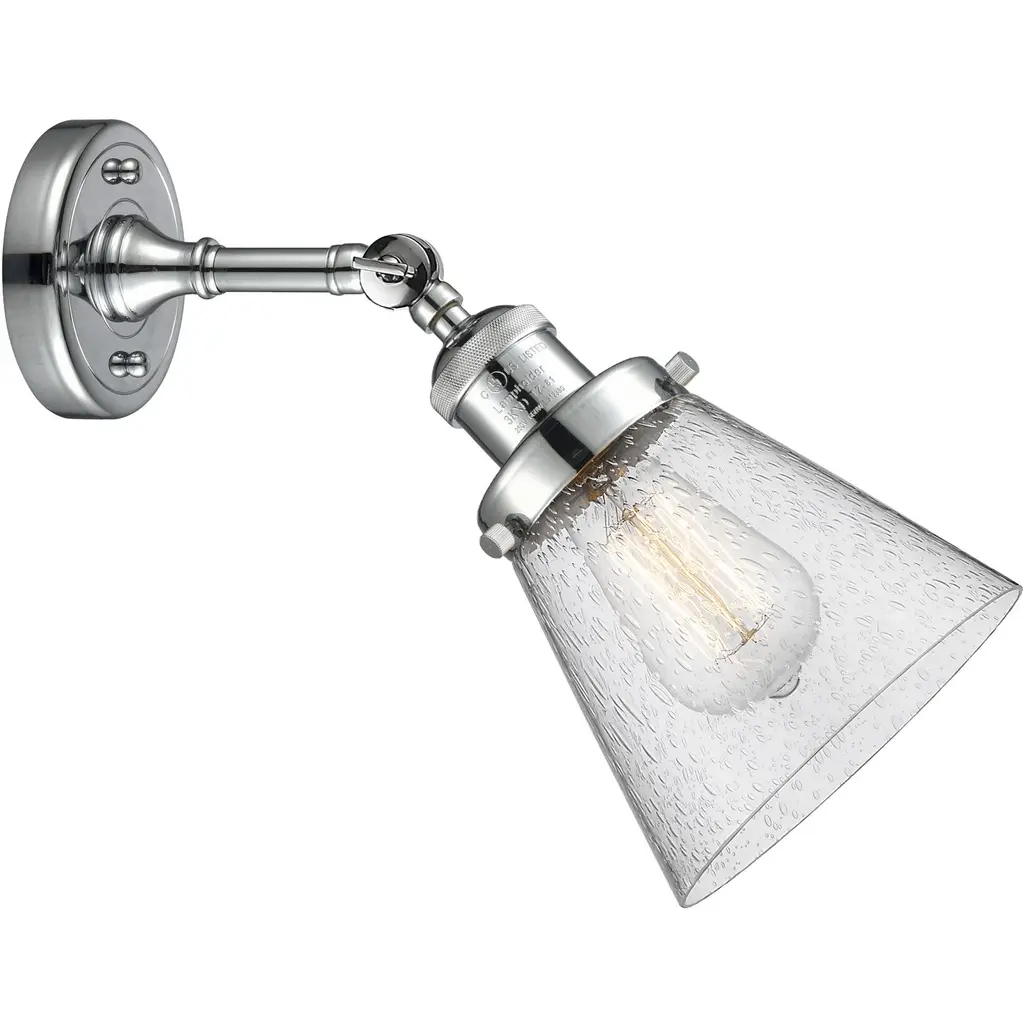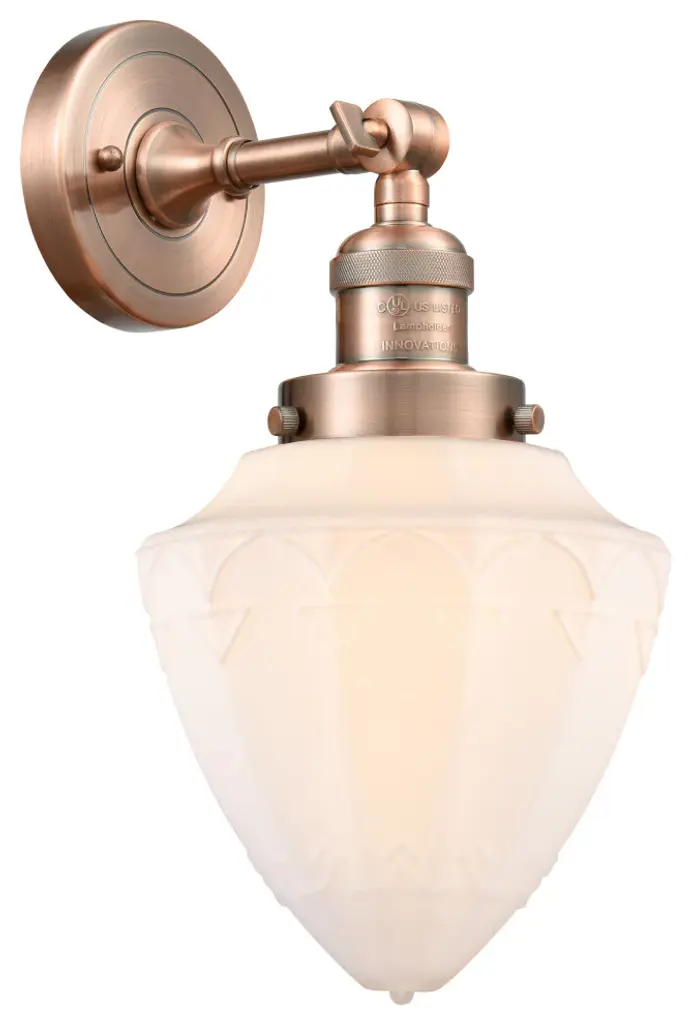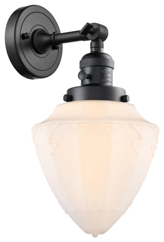 Innovations 203-PC-G661-7-LED Small Bullet 1 Light Sconce part of the Franklin Restoration Collection Polished Chrome. Collection: Franklin Restoration. Style: Traditional, Art Deco. Metal Finish: Polished Chrome. Metal Finish(Canopy/Backplate): Polished Chrome. Material: Steel, Cast Brass, Glass. Dimensions(in): 15(H) x 7(W) x 8.625(Ext). Bulb: (1)6W LED(Included). Maximum Wattage Per Socket: 100. Voltage: 120. Dimmable: Yes. Color Temperature (Kelvin): 2700. Color Rendering Index (CRI): 82. Lumens: 600. Life Expectancy (Hours): 15000. Glass Shade Description: Matte White Cased Small Bullet. Glass Type: Frosted. Shade Shape: Schoolhouse. Glass or Metal Shade Color: Matte White. Shade Material: Glass. Shade Dimensions(in): 7(W) x 8(H). Fitter Measurement (Glass or Metal Shade Fitter Size): 3.25 inch Fitter. Canopy Dimensions(in): 4.5(Dia). Backplate Dimenisons(in): 4.5(Dia) x 0.75(Depth). Mounting Center to Top: 2.25. Reversible (Can be hung with bulbs facing uo or down): Yes. Duo Mount: Yes. California Proposition 65 Warning Required: Yes. UL and ETL Certification: Damp Location.