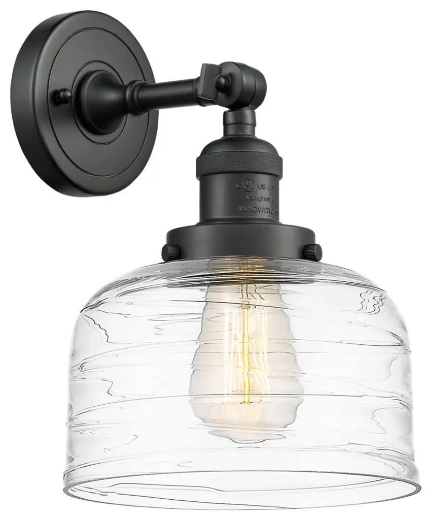 INNOVATIONS 203-PN-G713 1-Light Sconce Polished Nickel. Collection: Franklin Restoration. Style: Industrial, Farmhouse, Restoration-Vintage, Traditional. Metal Finish: Polished Nickel. Metal Finish (Canopy/Backplate): Polished Nickel. Material: Steel, Cast Brass, Glass. Dimension(in): 12(H) x 8(W) x 9. 375(Ext). Bulb: (1)60W Medium Base,Dimmable(Not Included). Maximum Wattage Per Socket: 100. Voltage: 120. Color Temperature (Kelvin): 2200. CRI: 99. 9. Lumens: 220. Glass Shade Description: Clear Deco Swirl Large Bell. Glass or Metal Shade Color: Clear Deco Swirl. Shade Material: Glass. Glass Type: Transparent. Shade Shape: Bell. Shade Dimension(in): 8(W) x 5. 75(H). Fitter Measurement (Glass Or Metal Shade Fitter Size): 3. 25 inch Fitter. Canopy Dimension(in): 4. 5(Dia). Backplate Dimension(in): 4. 5(Dia) x 0. 75(Depth). California Proposition 65 Warning Required: Yes. UL & ETL Certification: Damp Location.
