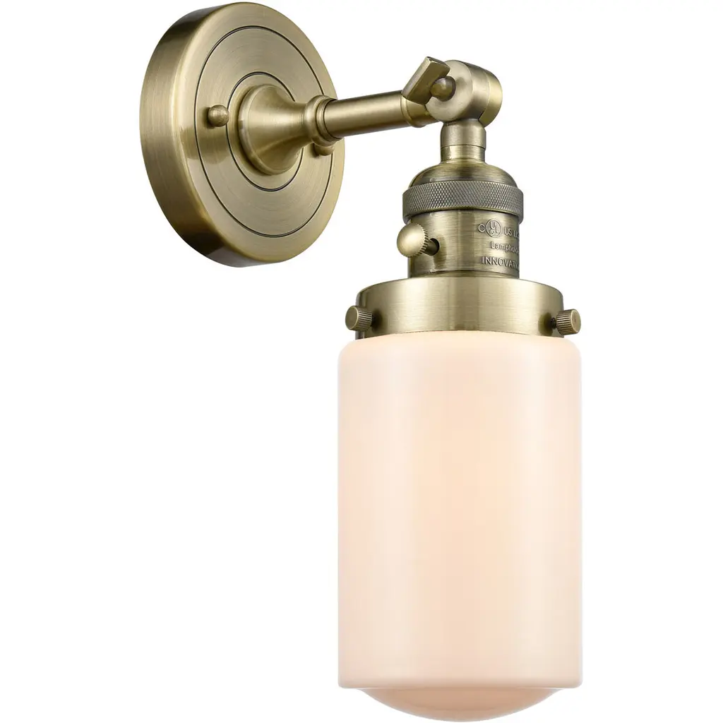 INNOVATIONS 203SW-SG-G661-7 1-Light Sconce Satin Gold. Collection: Franklin Restoration. Style: Traditional, Art Deco. Metal Finish: Satin Gold. Metal Finish (Canopy/Backplate): Satin Gold. Material: Steel, Cast Brass, Glass. Dimension(in): 15(H) x 7(W) x 8. 625(Ext). Bulb: (1)60W Medium Base,Dimmable(Not Included). Maximum Wattage Per Socket: 100. Voltage: 120. Color Temperature (Kelvin): 2200. CRI: 99. 9. Lumens: 220. Glass Shade Description: Matte White Cased Small Bullet. Glass or Metal Shade Color: Matte White. Shade Material: Glass. Glass Type: Frosted. Shade Shape: Schoolhouse. Shade Dimension(in): 7(W) x 8(H). Fitter Measurement (Glass Or Metal Shade Fitter Size): 3. 25 inch Fitter. Canopy Dimension(in): 4. 5(Dia). Backplate Dimension(in): 4. 5(Dia) x 0. 75(Depth). ADA Compliant: No. California Proposition 65 Warning Required: Yes. UL & ETL Certification: Damp Location.
