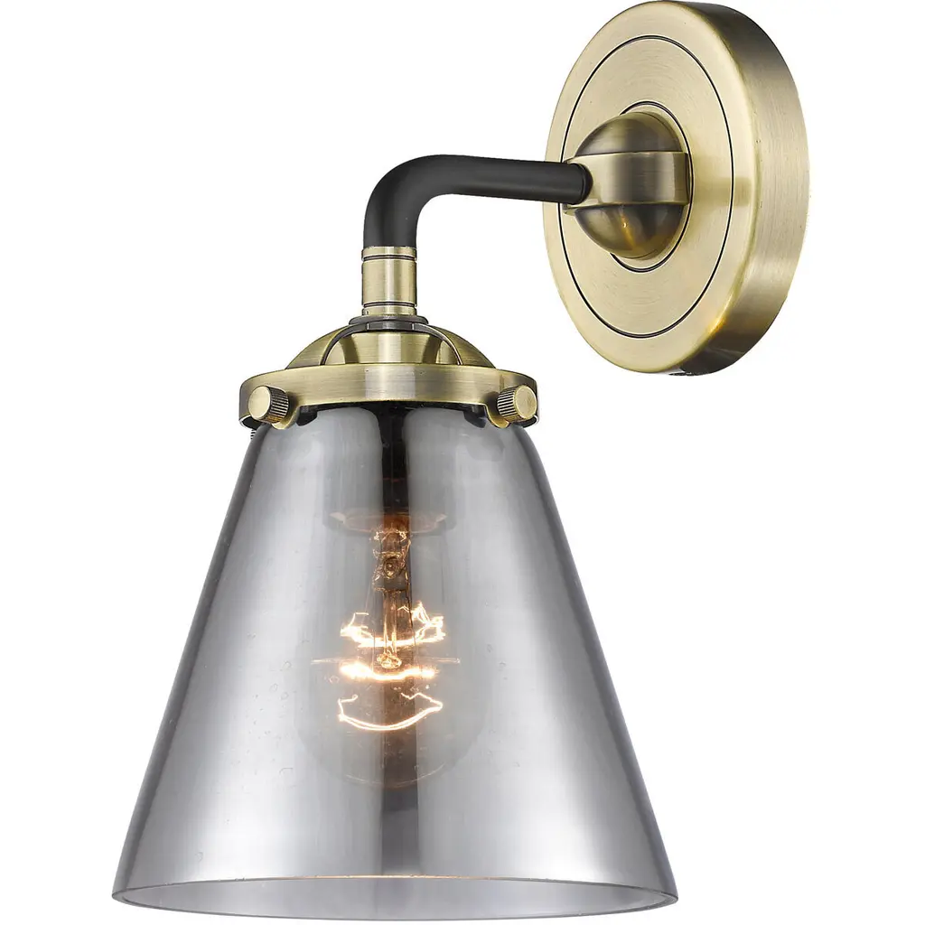 Innovations 288-1W-SG-G173 Fulton 1 Light 6.75" Sconce Satin Gold. Collection: Nouveau 2. Style: Transitional, Industrial, Farmhouse, Restoration-Vintage. Metal Finish: Satin Gold. Metal Finish(Canopy/Backplate): Satin Gold. Material: Steel, Cast Brass, Glass. Dimensions(in): 9.625(H) x 6.75(W) x 7.625(Ext). Bulb: (1)60W Medium Base Incandescent(Not Included). Maximum Wattage Per Socket: 100. Voltage: 120. Dimmable: Yes. Color Temperature (Kelvin): 2200. Color Rendering Index (CRI): 99.9. Lumens: 220. Life Expectancy (Hours): 2000. Glass Shade Description: Plated Smoke Fulton. Glass Type: Colorful. Shade Shape: Cone. Glass or Metal Shade Color: Plated Smoke. Shade Material: Glass. Shade Dimensions(in): 6.75(W) x 5.25(H). Fitter Measurement (Glass or Metal Shade Fitter Size): 3.25" Fitter. Canopy Dimensions(in): 4.5(Dia). Backplate Dimenisons(in): 4.5(Dia) x 0.75(Depth). Mounting Center to Top: 2.25. Reversible (Can be hung with bulbs facing uo or down): Yes. California Proposition 65 Warning Required: Yes. UL and ETL Certification: Damp Location.