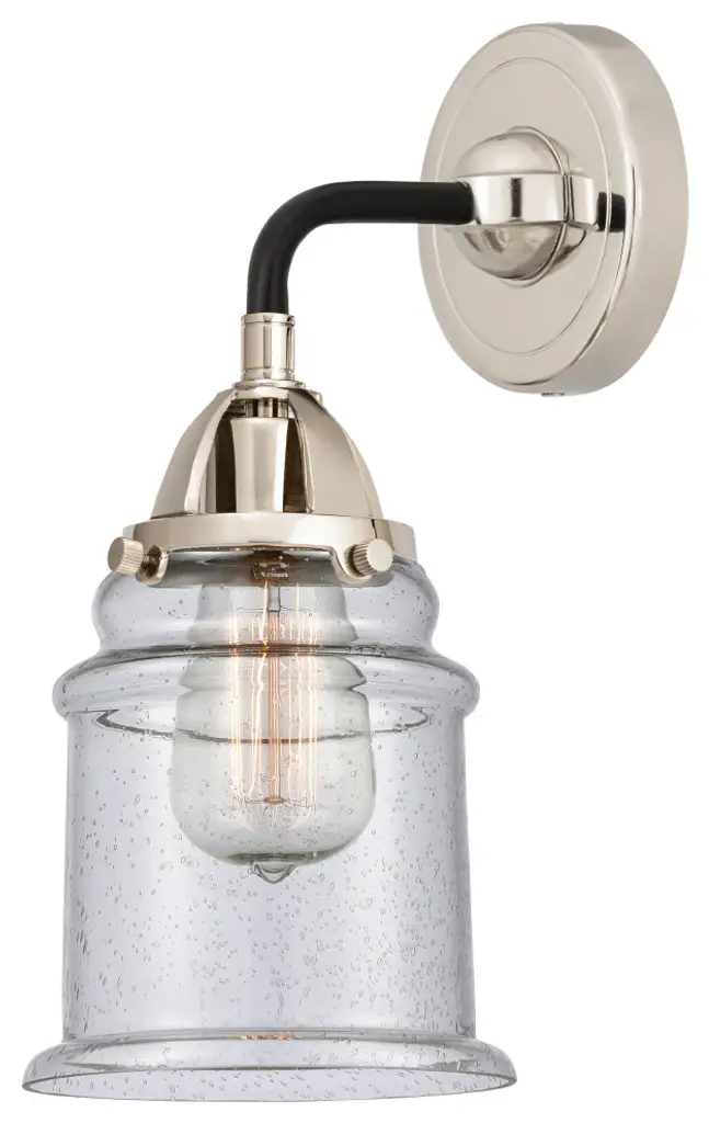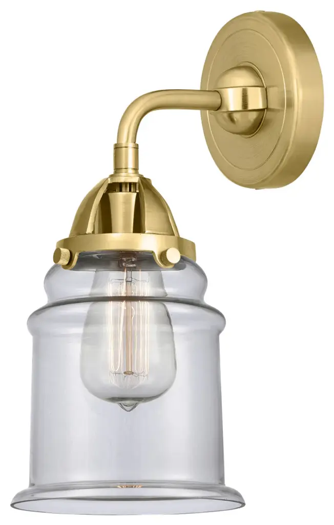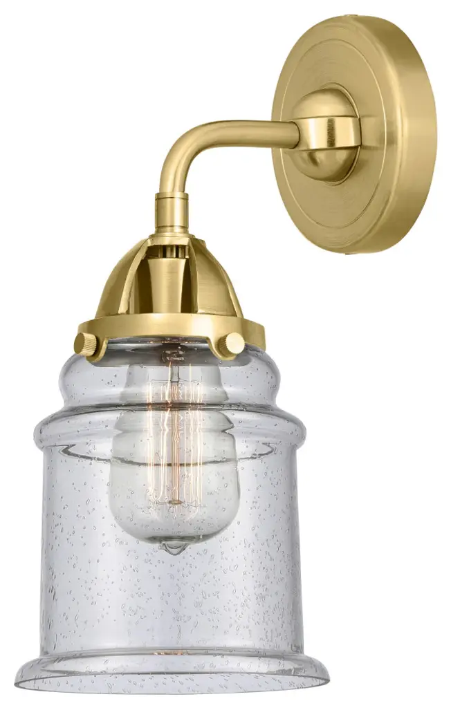 Innovations 288-1W-SG-G184 Canton 1 Light 6" Sconce Satin Gold. Collection: Nouveau 2. Style: Transitional, Industrial, Farmhouse, Seaside, Restoration-Vintage. Metal Finish: Satin Gold. Metal Finish(Canopy/Backplate): Satin Gold. Material: Steel, Cast Brass, Glass. Dimensions(in): 11.625(H) x 6(W) x 7.25(Ext). Bulb: (1)60W Medium Base Incandescent(Not Included). Maximum Wattage Per Socket: 100. Voltage: 120. Dimmable: Yes. Color Temperature (Kelvin): 2200. Color Rendering Index (CRI): 99.9. Lumens: 220. Life Expectancy (Hours): 2000. Glass Shade Description: Seedy Canton. Glass Type: Seeded. Shade Shape: Bell/Urn. Glass or Metal Shade Color: Seedy. Shade Material: Glass. Shade Dimensions(in): 6(W) x 7.25(H). Fitter Measurement (Glass or Metal Shade Fitter Size): 3.25" Fitter. Canopy Dimensions(in): 4.5(Dia). Backplate Dimenisons(in): 4.5(Dia) x 0.75(Depth). Mounting Center to Top: 2.25. Reversible (Can be hung with bulbs facing uo or down): Yes. California Proposition 65 Warning Required: Yes. UL and ETL Certification: Damp Location.