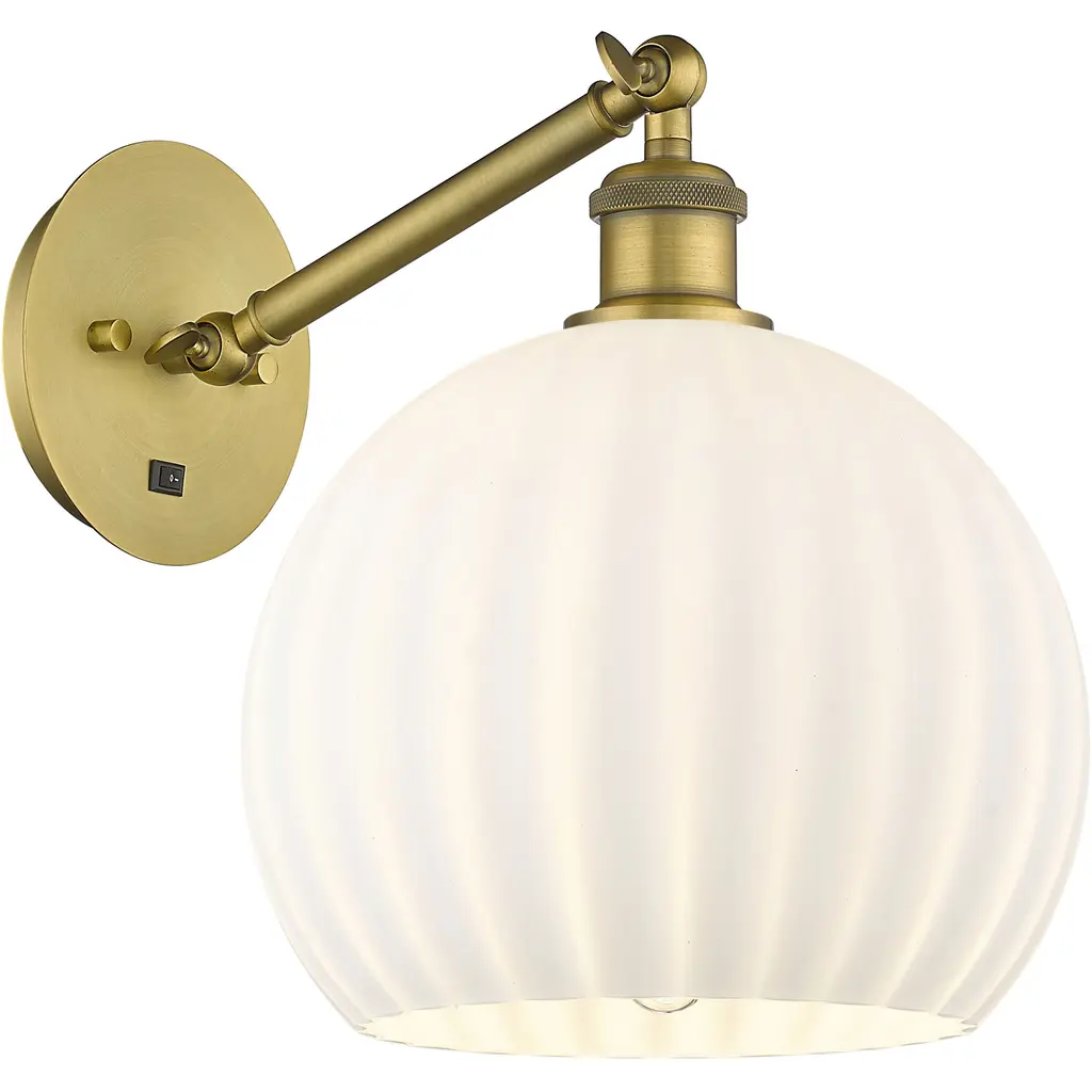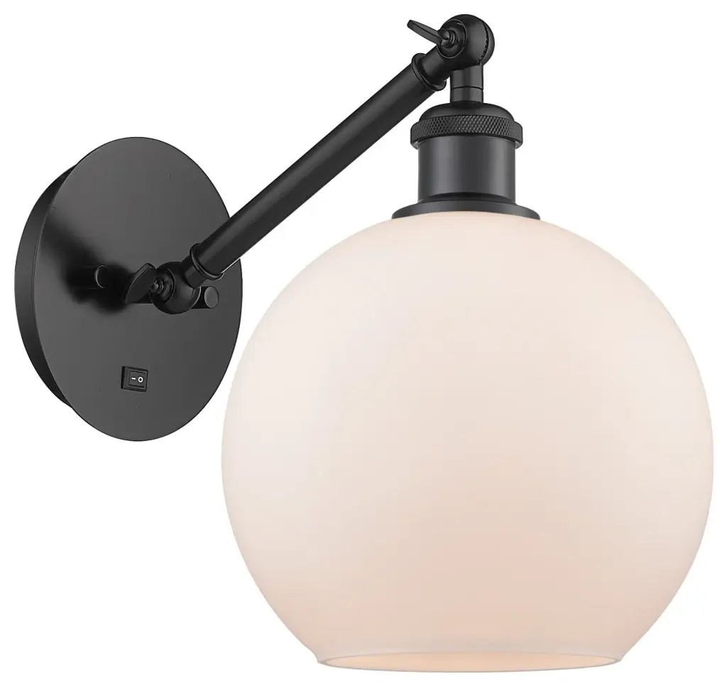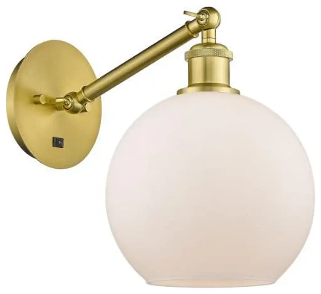 Innovations 317-1W-BB-G101-LED 1-Light Sconce Brushed Brass. Collection: Ballston. Style: Industrial, Modern Contempo, Restoration-Vintage, Transitional. Metal Finish: Brushed Brass. Metal Finish (Canopy/Backplate): Brushed Brass. Material: Steel, Cast Brass, Glass. Dimension(in): 12. 75(H) x 6(W) x 13(Ext). Bulb: (1)6W Medium Base,Dimmable(Not Included). Maximum Wattage Per Socket: 100. Voltage: 120. Color Temperature (Kelvin): 2700. CRI: 82. Lumens: 600. Glass Shade Description: Matte White Belfast. Glass or Metal Shade Color: Matte White. Shade Material: Glass. Glass Type: Frosted. Shade Shape: Sphere. Shade Dimension(in): 6(W) x 6(H). Fitter Measurement (Glass Or Metal Shade Fitter Size): Neckless with a 2. 125 inch Hole. Backplate Dimension(in): 5. 3(Dia) x 0. 75(Depth). ADA Compliant: No. California Proposition 65 Warning Required: Yes. UL and ETL Certification: Damp Location.