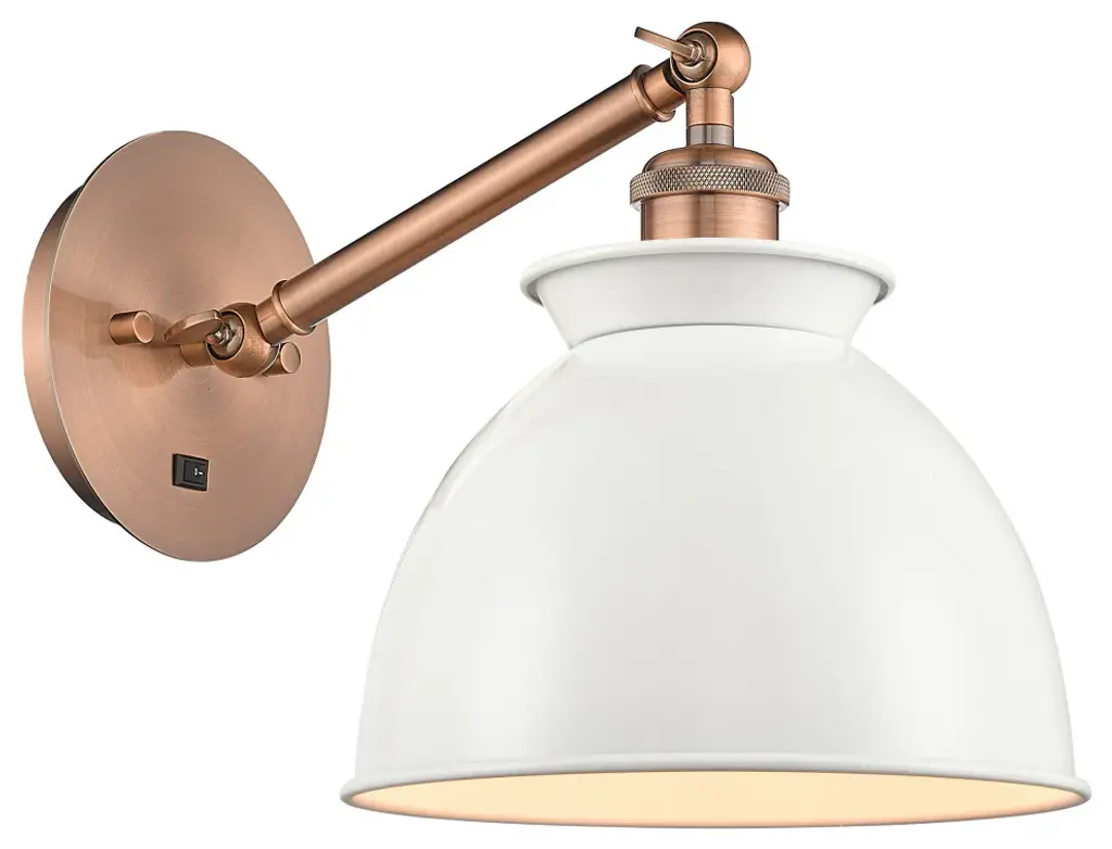 Innovations 317-1W-BB-M14-W Adirondack 1 Light Sconce part of the Ballston Collection Brushed Brass. Collection: Ballston. Style: Industrial, Farmhouse, Restoration-Vintage. Metal Finish: Brushed Brass. Metal Finish(Shade): Glossy White. Metal Finish(Canopy/Backplate): Brushed Brass. Material: Steel, Cast Brass. Dimensions(in): 12.25(H) x 8.125(W) x 14.125(Ext). Bulb: (1)60W Medium Base Incandescent(Not Included). Maximum Wattage Per Socket: 100. Switch Type Included: On/Off Rocker Switch. Voltage: 120. Dimmable: Yes. Color Temperature (Kelvin): 2200. Color Rendering Index (CRI): 99.9. Lumens: 220. Life Expectancy (Hours): 2000. Shade Shape: Dome. Glass or Metal Shade Color: Glossy White. Shade Material: Metal. Metal Shade Description: White Adirondack. Shade Dimensions(in): 8.25(W) x 5.5(H). Fitter Measurement (Glass or Metal Shade Fitter Size): Neckless with a 2.125" Hole. Backplate Dimenisons(in): 5.3(Dia) x 0.75(Depth). Mounting Center to Top: 2.65. ADA Compliant: No. Reversible (Can be hung with bulbs facing uo or down): Yes. California Proposition 65 Warning Required: Yes. UL and ETL Certification: Damp Location.