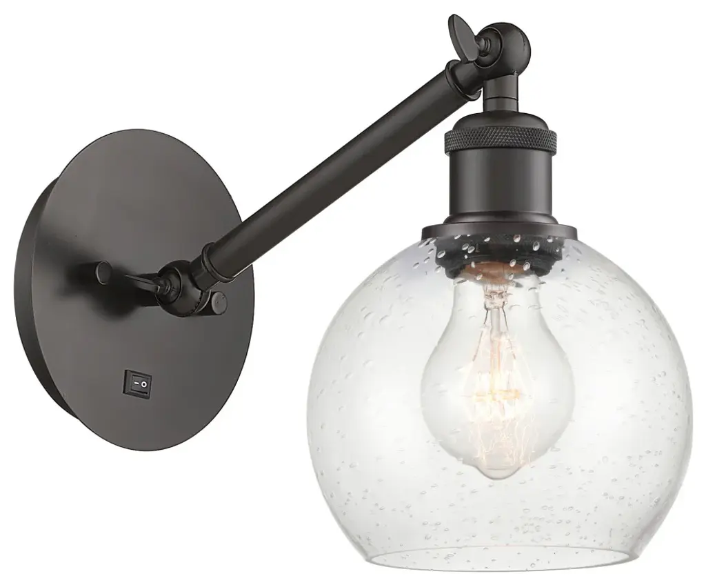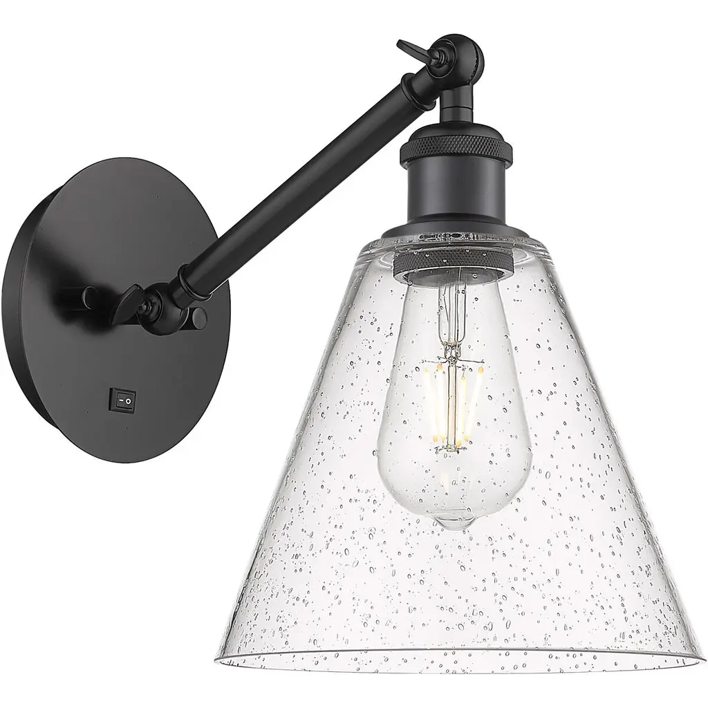 Innovations 317-1W-BK-G104-LED 1-Light Sconce Matte Black. Collection: Ballston. Style: Industrial, Modern Contempo, Restoration-Vintage, Transitional. Metal Finish: Matte Black. Metal Finish (Canopy/Backplate): Matte Black. Material: Steel, Cast Brass, Glass. Dimension(in): 12. 75(H) x 6(W) x 13(Ext). Bulb: (1)6W Medium Base,Dimmable(Not Included). Maximum Wattage Per Socket: 100. Voltage: 120. Color Temperature (Kelvin): 2700. CRI: 82. Lumens: 600. Glass Shade Description: Seedy Belfast. Glass or Metal Shade Color: Seedy. Shade Material: Glass. Glass Type: Seeded. Shade Shape: Sphere. Shade Dimension(in): 6(W) x 6(H). Fitter Measurement (Glass Or Metal Shade Fitter Size): Neckless with a 2. 125 inch Hole. Backplate Dimension(in): 5. 3(Dia) x 0. 75(Depth). ADA Compliant: No. California Proposition 65 Warning Required: Yes. UL and ETL Certification: Damp Location.