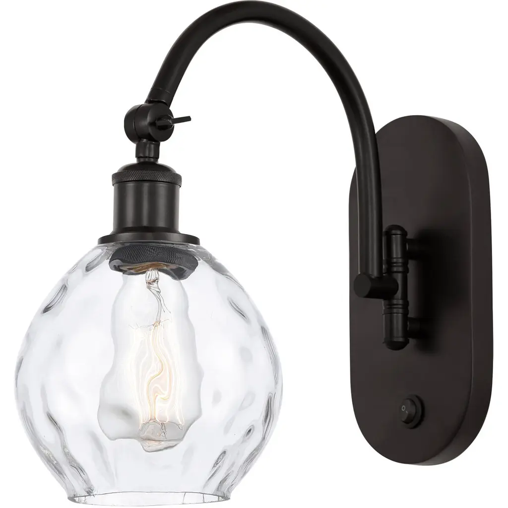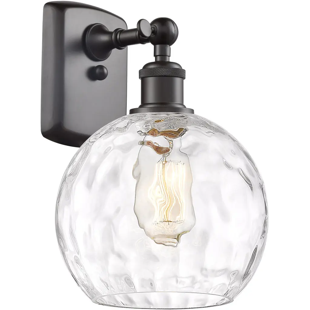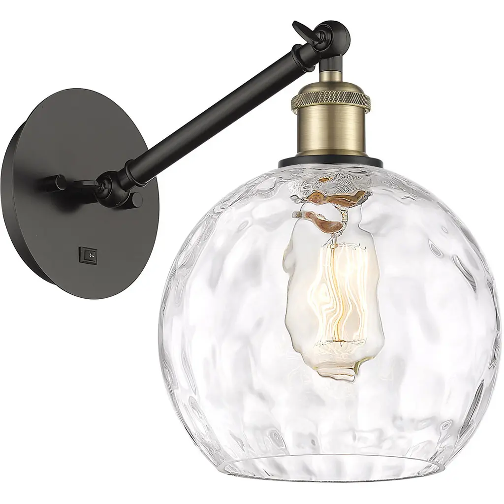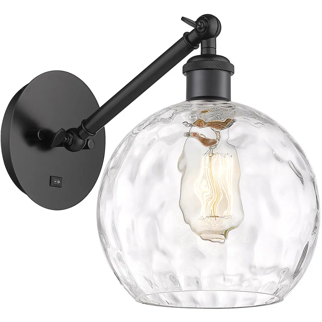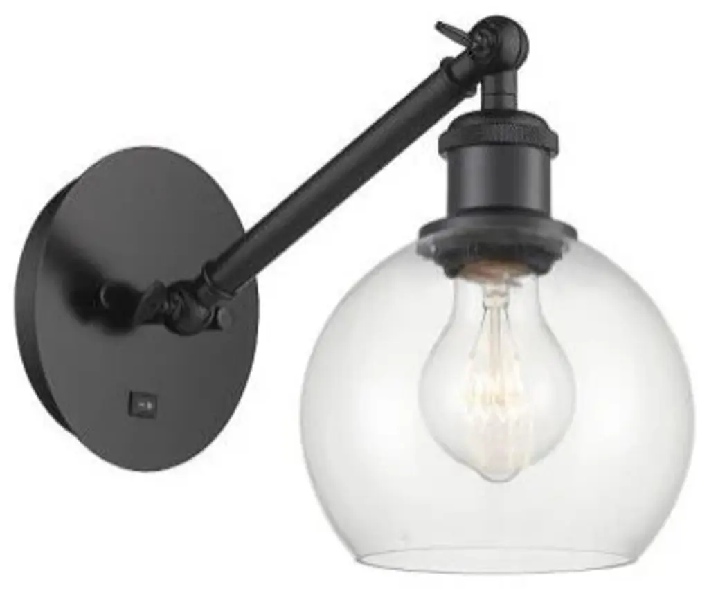 Innovations 317-1W-BK-G1215-8 1-Light Sconce Matte Black. Collection: Ballston. Style: Industrial, Modern Contempo, Restoration-Vintage, Transitional. Metal Finish: Matte Black. Metal Finish (Canopy/Backplate): Matte Black. Material: Steel, Cast Brass, Glass. Dimension(in): 13. 75(H) x 8(W) x 14(Ext). Bulb: (1)60W Medium Base,Dimmable(Not Included). Maximum Wattage Per Socket: 100. Voltage: 120. Color Temperature (Kelvin): 2200. CRI: 99. 9. Lumens: 220. Glass Shade Description: Clear Athens Water Glass 8". Glass or Metal Shade Color: Clear Water Glass. Shade Material: Glass. Glass Type: Transparent. Shade Shape: Sphere. Shade Dimension(in): 8(W) x 7(H). Fitter Measurement (Glass Or Metal Shade Fitter Size): Neckless with a 2. 125 inch Hole. Backplate Dimension(in): 5. 3(Dia) x 0. 75(Depth). ADA Compliant: No. California Proposition 65 Warning Required: Yes. UL and ETL Certification: Damp Location.