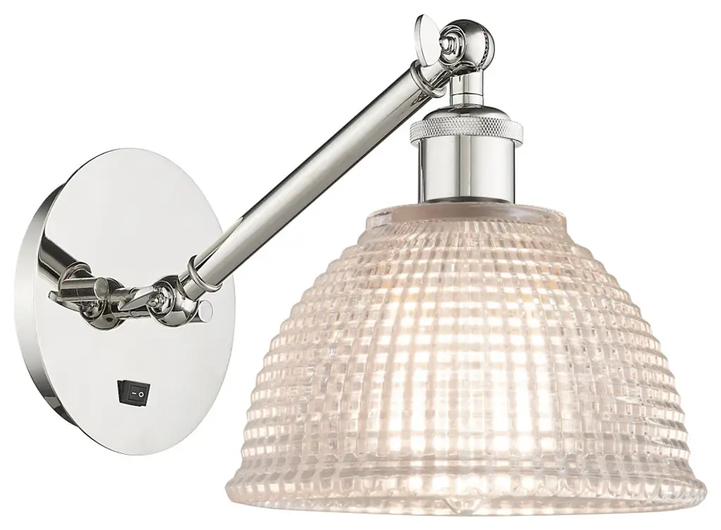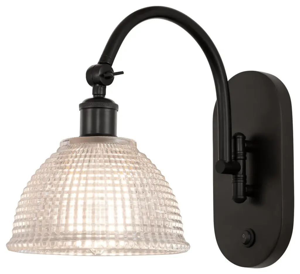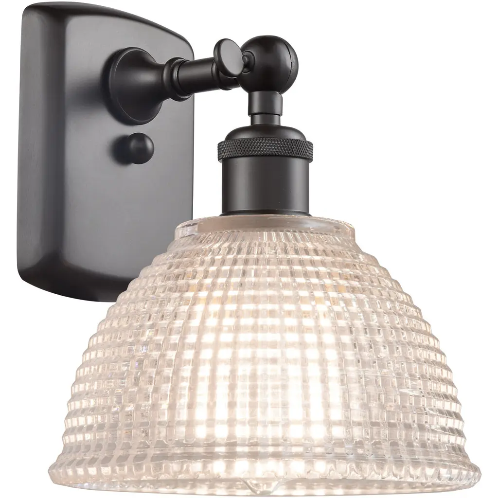 Innovations 317-1W-BK-G422-LED 1-Light Sconce Matte Black. Collection: Ballston. Style: Industrial, Modern Contempo, Restoration-Vintage, Transitional. Metal Finish: Matte Black. Metal Finish (Canopy/Backplate): Matte Black. Material: Steel, Cast Brass, Glass. Dimension(in): 11. 75(H) x 8(W) x 14(Ext). Bulb: (1)6W Medium Base,Dimmable(Not Included). Maximum Wattage Per Socket: 100. Voltage: 120. Color Temperature (Kelvin): 2700. CRI: 82. Lumens: 600. Glass Shade Description: Clear Arietta. Glass or Metal Shade Color: Clear. Shade Material: Glass. Glass Type: Transparent. Shade Shape: Dome. Shade Dimension(in): 8(W) x 5(H). Fitter Measurement (Glass Or Metal Shade Fitter Size): Neckless with a 2. 125 inch Hole. Backplate Dimension(in): 5. 3(Dia) x 0. 75(Depth). ADA Compliant: No. California Proposition 65 Warning Required: Yes. UL and ETL Certification: Damp Location.