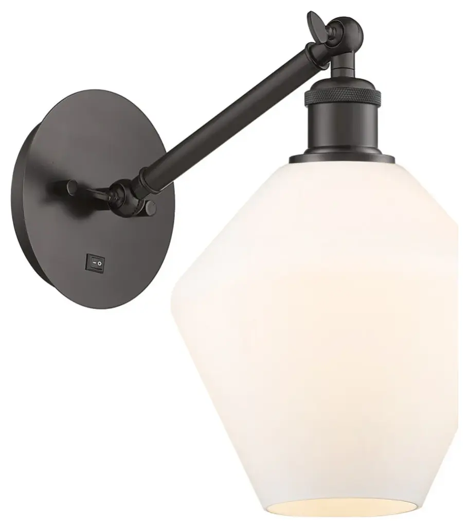 Innovations 317-1W-BK-G651-6 1-Light Sconce Matte Black. Collection: Ballston. Style: Industrial, Modern Contempo, Restoration-Vintage, Transitional. Metal Finish: Matte Black. Metal Finish (Canopy/Backplate): Matte Black. Material: Steel, Cast Brass, Glass. Dimension(in): 11. 375(H) x 6(W) x 12. 875(Ext). Bulb: (1)60W Medium Base,Dimmable(Not Included). Maximum Wattage Per Socket: 100. Voltage: 120. Color Temperature (Kelvin): 2200. CRI: 99. 9. Lumens: 220. Glass Shade Description: Cased Matte White Cindyrella 6". Glass or Metal Shade Color: Cased Matte White. Shade Material: Glass. Glass Type: Frosted. Shade Shape: Geometric. Shade Dimension(in): 6(W) x 6. 5(H). Fitter Measurement (Glass Or Metal Shade Fitter Size): Neckless with a 2. 125 inch Hole. Backplate Dimension(in): 5. 3(Dia) x 0. 75(Depth). ADA Compliant: No. California Proposition 65 Warning Required: Yes. UL and ETL Certification: Damp Location.