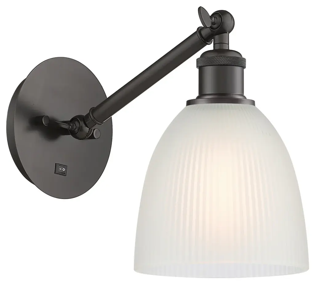 Innovations 317-1W-BK-GBD-751 1-Light Sconce Matte Black. Collection: Ballston. Style: Industrial, Modern Contempo, Restoration-Vintage, Transitional. Metal Finish: Matte Black. Metal Finish (Canopy/Backplate): Matte Black. Material: Steel, Cast Brass, Glass. Dimension(in): 13. 25(H) x 8(W) x 13. 75(Ext). Bulb: (1)60W Medium Base,Dimmable(Not Included). Maximum Wattage Per Socket: 100. Voltage: 120. Color Temperature (Kelvin): 2200. CRI: 99. 9. Lumens: 220. Glass Shade Description: Matte White Ballston Dome. Glass or Metal Shade Color: Matte White. Shade Material: Glass. Glass Type: Frosted. Shade Shape: Dome. Shade Dimension(in): 7. 5(W) x 6. 5(H). Fitter Measurement (Glass Or Metal Shade Fitter Size): Neckless with a 2. 125 inch Hole. Backplate Dimension(in): 5. 3(Dia) x 0. 75(Depth). ADA Compliant: No. California Proposition 65 Warning Required: Yes. UL and ETL Certification: Damp Location.
