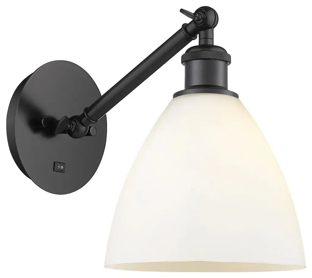 Innovations 317-1W-BK-M14-W Adirondack 1 Light Sconce part of the Ballston Collection Matte Black. Collection: Ballston. Style: Industrial, Farmhouse, Restoration-Vintage. Metal Finish: Matte Black. Metal Finish(Shade): Glossy White. Metal Finish(Canopy/Backplate): Matte Black. Material: Steel, Cast Brass. Dimensions(in): 12.25(H) x 8.125(W) x 14.125(Ext). Bulb: (1)60W Medium Base Incandescent(Not Included). Maximum Wattage Per Socket: 100. Switch Type Included: On/Off Rocker Switch. Voltage: 120. Dimmable: Yes. Color Temperature (Kelvin): 2200. Color Rendering Index (CRI): 99.9. Lumens: 220. Life Expectancy (Hours): 2000. Shade Shape: Dome. Glass or Metal Shade Color: Glossy White. Shade Material: Metal. Metal Shade Description: White Adirondack. Shade Dimensions(in): 8.25(W) x 5.5(H). Fitter Measurement (Glass or Metal Shade Fitter Size): Neckless with a 2.125" Hole. Backplate Dimenisons(in): 5.3(Dia) x 0.75(Depth). Mounting Center to Top: 2.65. ADA Compliant: No. Reversible (Can be hung with bulbs facing uo or down): Yes. California Proposition 65 Warning Required: Yes. UL and ETL Certification: Damp Location.