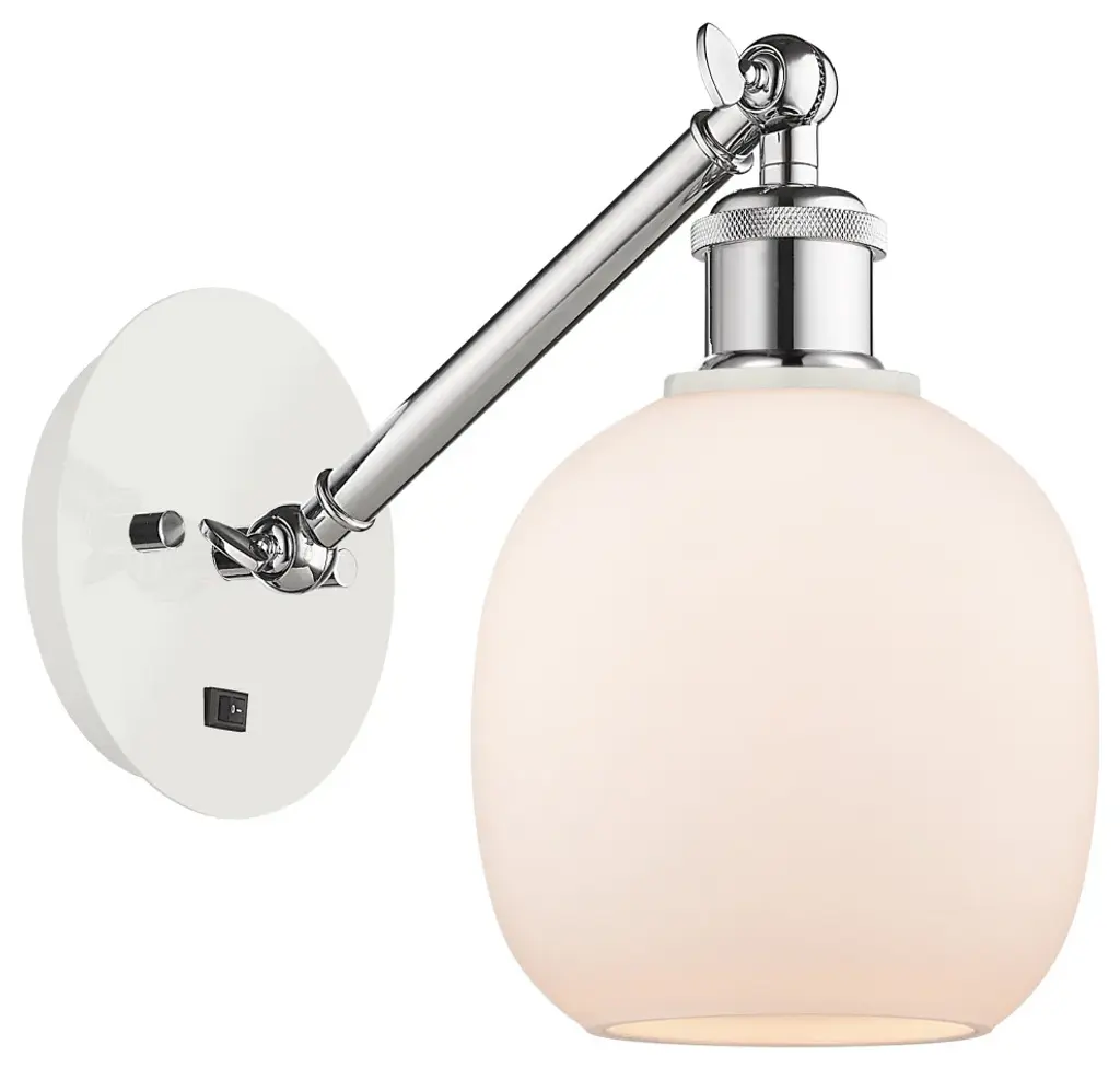 Innovations 317-1W-PN-G101-LED 1-Light Sconce Polished Nickel. Collection: Ballston. Style: Industrial, Modern Contempo, Restoration-Vintage, Transitional. Metal Finish: Polished Nickel. Metal Finish (Canopy/Backplate): Polished Nickel. Material: Steel, Cast Brass, Glass. Dimension(in): 12. 75(H) x 6(W) x 13(Ext). Bulb: (1)6W Medium Base,Dimmable(Not Included). Maximum Wattage Per Socket: 100. Voltage: 120. Color Temperature (Kelvin): 2700. CRI: 82. Lumens: 600. Glass Shade Description: Matte White Belfast. Glass or Metal Shade Color: Matte White. Shade Material: Glass. Glass Type: Frosted. Shade Shape: Sphere. Shade Dimension(in): 6(W) x 6(H). Fitter Measurement (Glass Or Metal Shade Fitter Size): Neckless with a 2. 125 inch Hole. Backplate Dimension(in): 5. 3(Dia) x 0. 75(Depth). ADA Compliant: No. California Proposition 65 Warning Required: Yes. UL and ETL Certification: Damp Location.