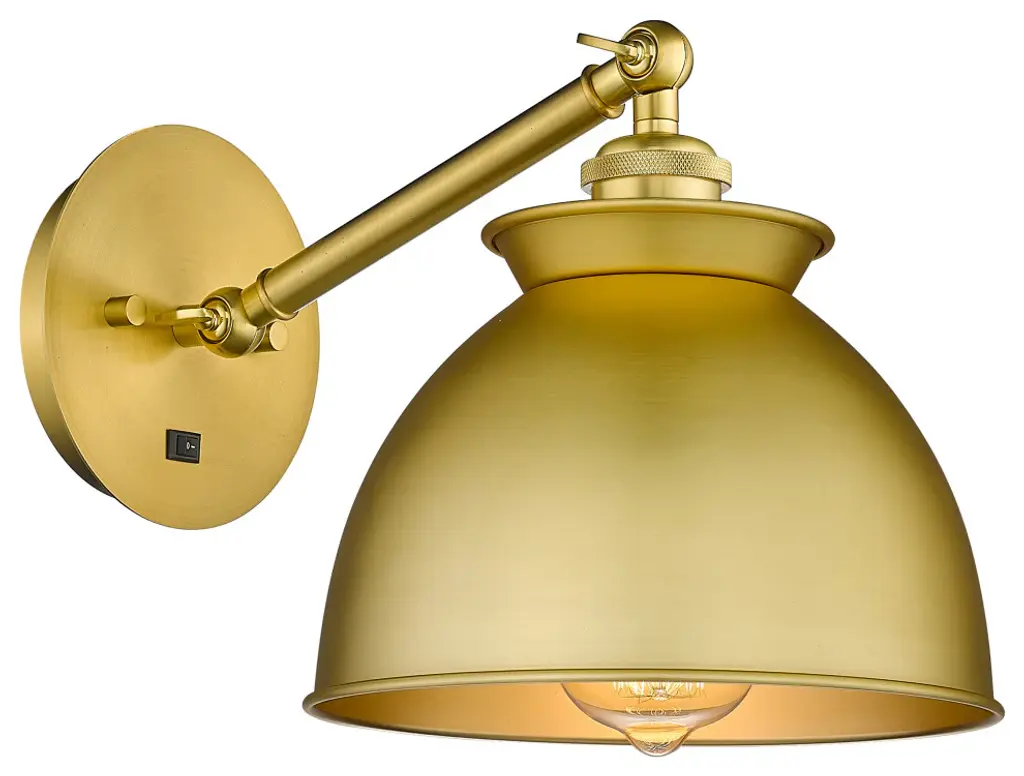 Innovations 317-1W-SG-M14-W Adirondack 1 Light Sconce part of the Ballston Collection Satin Gold. Collection: Ballston. Style: Industrial, Farmhouse, Restoration-Vintage. Metal Finish: Satin Gold. Metal Finish(Shade): Glossy White. Metal Finish(Canopy/Backplate): Satin Gold. Material: Steel, Cast Brass. Dimensions(in): 12.25(H) x 8.125(W) x 14.125(Ext). Bulb: (1)60W Medium Base Incandescent(Not Included). Maximum Wattage Per Socket: 100. Switch Type Included: On/Off Rocker Switch. Voltage: 120. Dimmable: Yes. Color Temperature (Kelvin): 2200. Color Rendering Index (CRI): 99.9. Lumens: 220. Life Expectancy (Hours): 2000. Shade Shape: Dome. Glass or Metal Shade Color: Glossy White. Shade Material: Metal. Metal Shade Description: White Adirondack. Shade Dimensions(in): 8.25(W) x 5.5(H). Fitter Measurement (Glass or Metal Shade Fitter Size): Neckless with a 2.125" Hole. Backplate Dimenisons(in): 5.3(Dia) x 0.75(Depth). Mounting Center to Top: 2.65. ADA Compliant: No. Reversible (Can be hung with bulbs facing uo or down): Yes. California Proposition 65 Warning Required: Yes. UL and ETL Certification: Damp Location.