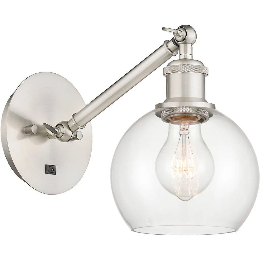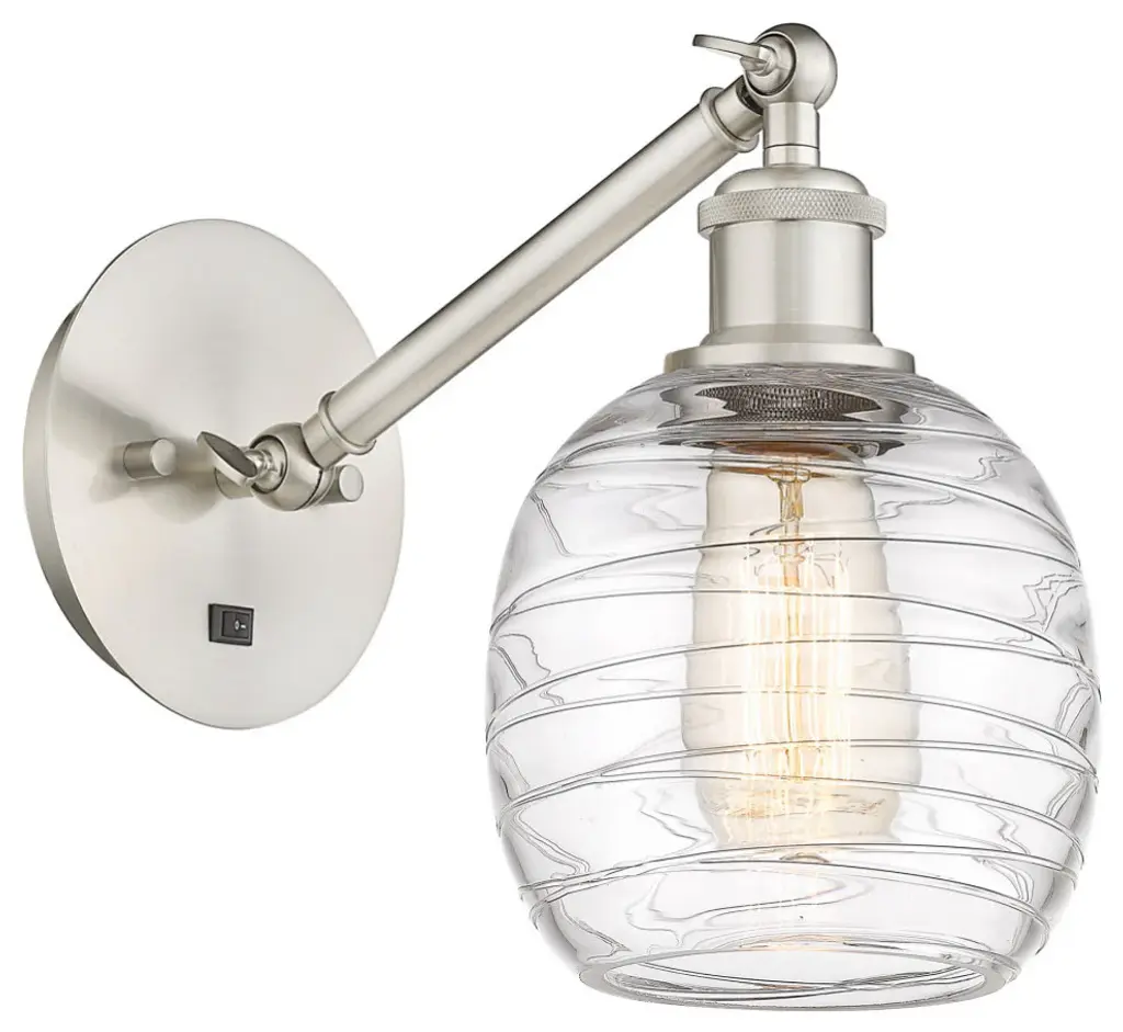 Innovations 317-1W-SN-G104-LED Belfast 1 Light Sconce part of the Ballston Collection Brushed Satin Nickel. Collection: Ballston. Style: Industrial, Modern Contempo, Restoration-Vintage, Transitional. Metal Finish: Brushed Satin Nickel. Metal Finish(Canopy/Backplate): Brushed Satin Nickel. Material: Steel, Cast Brass, Glass. Dimensions(in): 12.75(H) x 6(W) x 13(Ext). Bulb: (1)6W LED(Included). Maximum Wattage Per Socket: 100. Switch Type Included: On/Off Rocker Switch. Voltage: 120. Dimmable: Yes. Color Temperature (Kelvin): 2700. Color Rendering Index (CRI): 82. Lumens: 600. Life Expectancy (Hours): 15000. Glass Shade Description: Seedy Belfast. Glass Type: Seeded. Shade Shape: Globe/Orb. Glass or Metal Shade Color: Seedy. Shade Material: Glass. Shade Dimensions(in): 6(W) x 6(H). Fitter Measurement (Glass or Metal Shade Fitter Size): Neckless with a 2.125" Hole. Backplate Dimenisons(in): 5.3(Dia) x 0.75(Depth). Mounting Center to Top: 2.65. ADA Compliant: No. Reversible (Can be hung with bulbs facing uo or down): Yes. California Proposition 65 Warning Required: Yes. UL and ETL Certification: Damp Location.