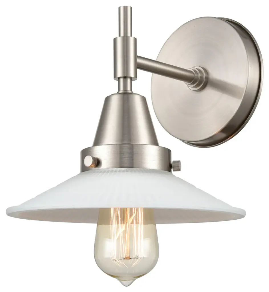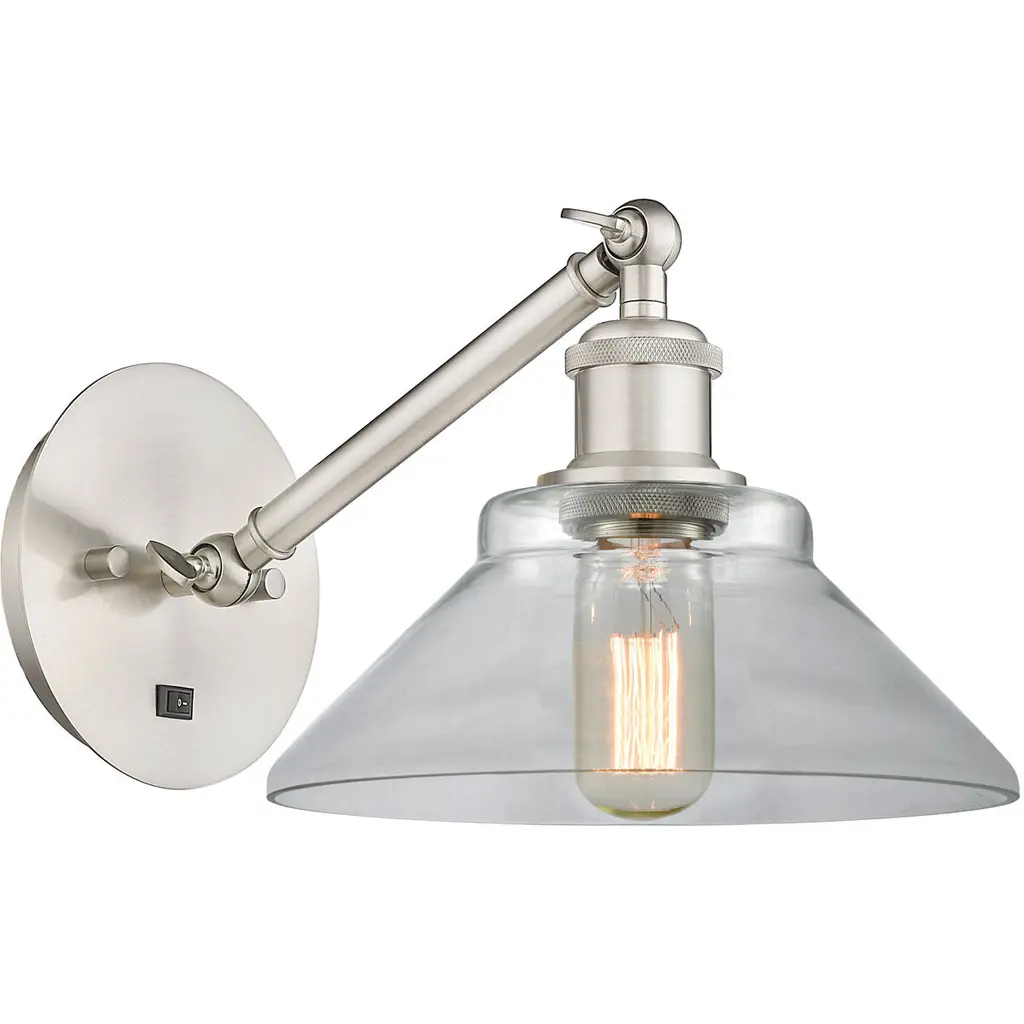 Innovations 317-1W-SN-G132 Orwell 1 Light 8.375" Sconce Brushed Satin Nickel. Collection: Ballston. Style: Industrial, Modern Contempo, Restoration-Vintage, Transitional. Metal Finish: Brushed Satin Nickel. Metal Finish(Canopy/Backplate): Brushed Satin Nickel. Material: Steel, Cast Brass, Glass. Dimensions(in): 11(H) x 8.375(W) x 14.1875(Ext). Bulb: (1)60W Medium Base Incandescent(Not Included). Maximum Wattage Per Socket: 100. Switch Type Included: On/Off Rocker Switch. Voltage: 120. Dimmable: Yes. Color Temperature (Kelvin): 2200. Color Rendering Index (CRI): 99.9. Lumens: 220. Life Expectancy (Hours): 2000. Glass Shade Description: Clear Orwell. Glass Type: Transparent. Shade Shape: Cone. Glass or Metal Shade Color: Clear. Shade Material: Glass. Shade Dimensions(in): 8.375(W) x 4(H). Fitter Measurement (Glass or Metal Shade Fitter Size): Neckless with a 2.125" Hole. Backplate Dimenisons(in): 5.3(Dia) x 0.75(Depth). Mounting Center to Top: 2.65. ADA Compliant: No. Reversible (Can be hung with bulbs facing uo or down): Yes. California Proposition 65 Warning Required: Yes. UL and ETL Certification: Damp Location.