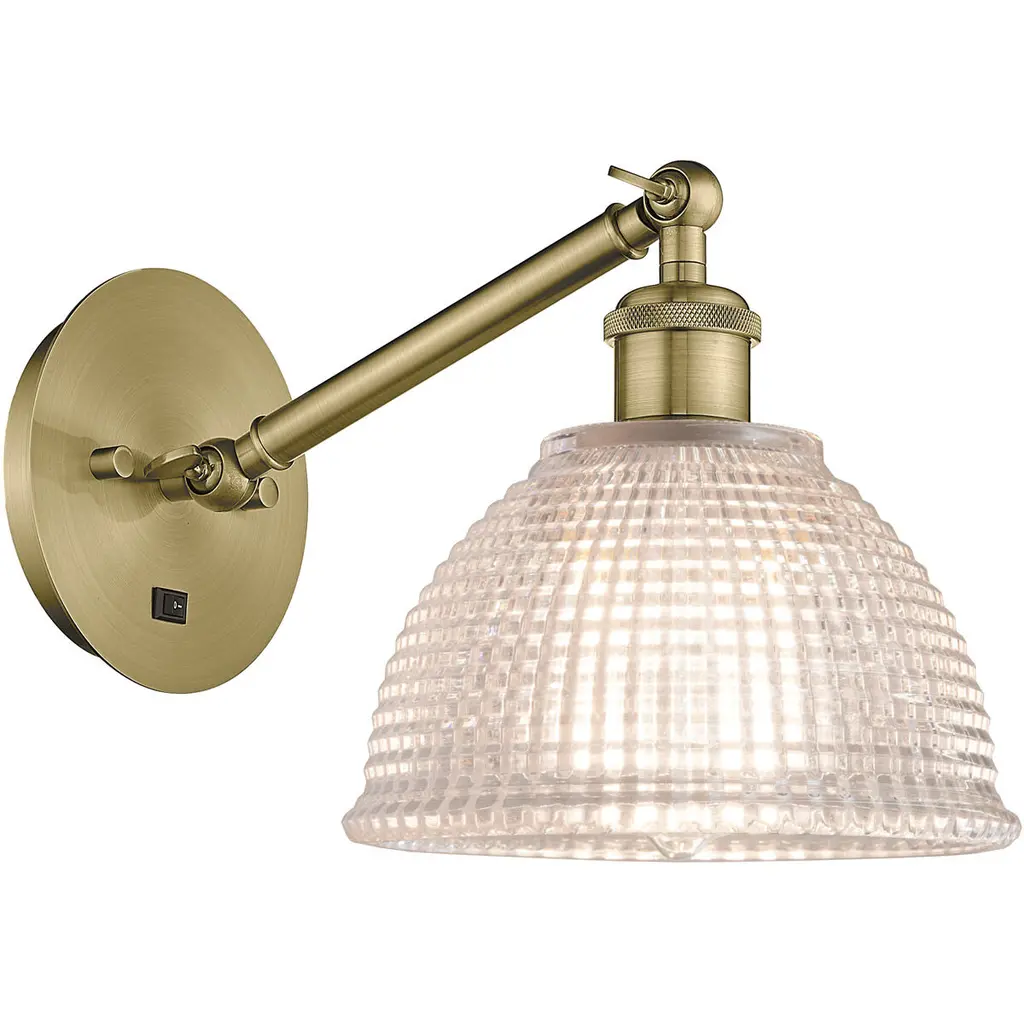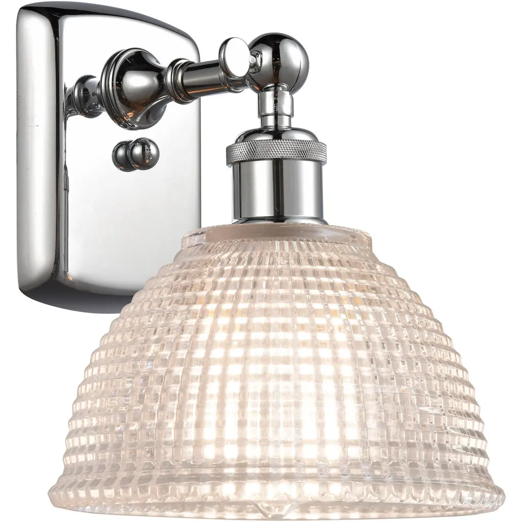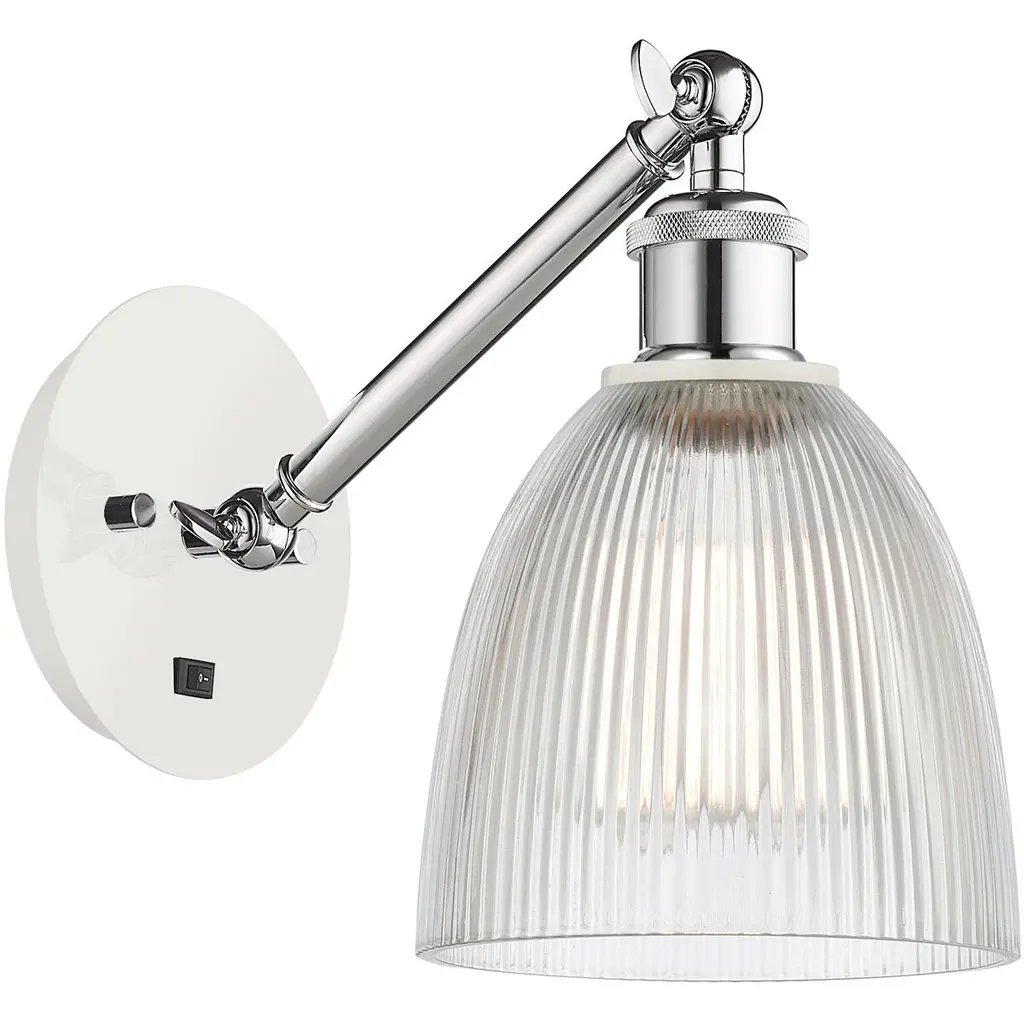 Innovations 317-1W-WPC-G422-LED 1-Light Sconce White and Polished Chrome. Collection: Ballston. Style: Industrial, Modern Contempo, Restoration-Vintage, Transitional. Metal Finish: White and Polished Chrome. Metal Finish (Canopy/Backplate): White. Accent Color: Polished Chrome. Material: Steel, Cast Brass, Glass. Dimension(in): 11. 75(H) x 8(W) x 14(Ext). Bulb: (1)6W Medium Base,Dimmable(Not Included). Maximum Wattage Per Socket: 100. Voltage: 120. Color Temperature (Kelvin): 2700. CRI: 82. Lumens: 600. Glass Shade Description: Clear Arietta. Glass or Metal Shade Color: Clear. Shade Material: Glass. Glass Type: Transparent. Shade Shape: Dome. Shade Dimension(in): 8(W) x 5(H). Fitter Measurement (Glass Or Metal Shade Fitter Size): Neckless with a 2. 125 inch Hole. Backplate Dimension(in): 5. 3(Dia) x 0. 75(Depth). ADA Compliant: No. California Proposition 65 Warning Required: Yes. UL and ETL Certification: Damp Location.