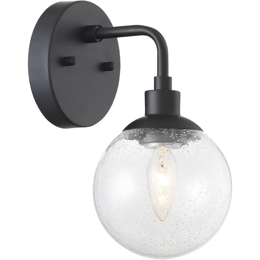 Innovations 341-1W-BK-G124-6 Concord 1 Light 6" Sconce Matte Black. Collection: Concord. Style: Industrial, Modern Contempo, Restoration-Vintage, Transitional. Metal Finish: Matte Black. Metal Finish(Canopy/Backplate): Matte Black. Accent Color: Polished Nickel. Material: Steel, Cast Brass, Glass. Dimensions(in): 10.5(H) x 6(W) x 7.5(Ext). Bulb: (1)60W Medium Base Incandescent(Not Included). Maximum Wattage Per Socket: 100. Voltage: 120. Dimmable: Yes. Color Temperature (Kelvin): 2100. Color Rendering Index (CRI): 98. Lumens: 245. Life Expectancy (Hours): 1500. Glass Shade Description: Seedy Concord. Glass Type: Seeded. Shade Shape: Globe/Orb. Glass or Metal Shade Color: Seedy. Shade Material: Glass. Shade Dimensions(in): 6(W) x 5.75(H). Fitter Measurement (Glass or Metal Shade Fitter Size): Neckless with a 2.125" Hole. Canopy Dimensions(in): 4.5(Dia). Backplate Dimenisons(in): 5(Dia) x 0.75(Depth). Mounting Center to Top: 2.5. Reversible (Can be hung with bulbs facing uo or down): Yes. California Proposition 65 Warning Required: Yes. UL and ETL Certification: Damp Location.