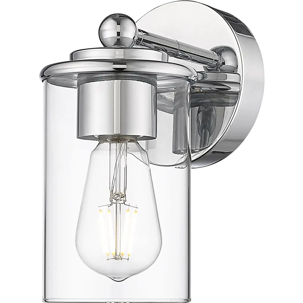 Innovations 423-1W-PC-4CL-LED Pilaster 1 Light 8 inch Sconce Polished Nickel. Collection: Pilaster. Style: Restoration. Metal Finish: Polished Nickel. Metal Finish(Canopy/Backplate): Polished Nickel. Material: Steel, Cast Brass, Glass. Dimensions(in): 10.5(H) x 4.5(W) x 5.5(Ext). Bulb: (1)6W LED(Included). Maximum Wattage Per Socket: 100. Voltage: 120. Dimmable: Yes. Color Temperature (Kelvin): 2700. Color Rendering Index (CRI): 90. Lumens: 750. Life Expectancy (Hours): 15000. Glass Shade Description: Clear Pilaster. Glass Type: Transparent. Shade Shape: Cylinder. Glass or Metal Shade Color: Clear. Shade Material: Glass. Shade Dimensions(in): 3.875(W) x 7(H). Backplate Dimenisons(in): 4.5(Dia) x 0.75(Depth). Mounting Center to Top: 2.25. ADA Compliant: No. Reversible (Can be hung with bulbs facing uo or down): No. Duo Mount: No. California Proposition 65 Warning Required: Yes. UL and ETL Certification: Damp Location.