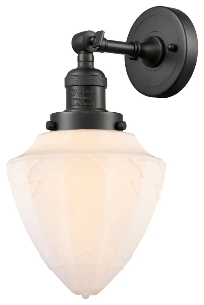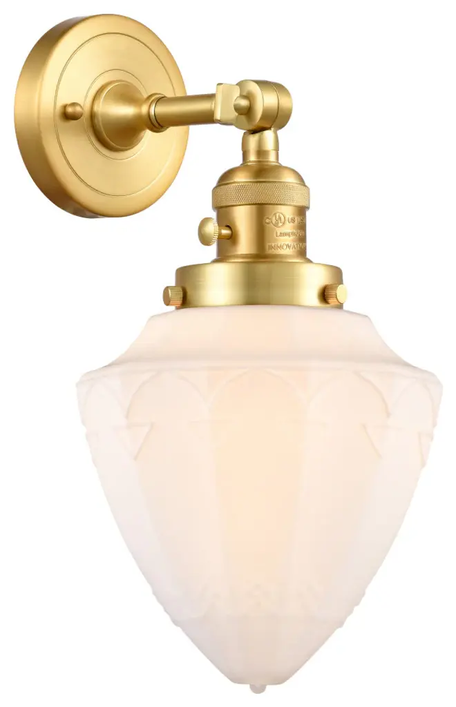 Innovations 515-1W-PC-G661-7-LED 1-Light Sconce Polished Chrome. Collection: Franklin Restoration. Style: Traditional, Art Deco. Metal Finish: Polished Chrome. Metal Finish (Canopy/Backplate): Polished Chrome. Material: Steel, Cast Brass, Glass. Dimension(in): 19. 5(H) x 7(W) x 9. 5(Ext). Bulb: (1)6W Medium Base,Dimmable(Not Included). Maximum Wattage Per Socket: 100. Voltage: 120. Color Temperature (Kelvin): 2700. CRI: 82. Lumens: 600. Glass Shade Description: Matte White Cased Bullet. Glass or Metal Shade Color: Matte White. Shade Material: Glass. Glass Type: Frosted. Shade Shape: Globe. Shade Dimension(in): 7(W) x 8(H). Fitter Measurement (Glass Or Metal Shade Fitter Size): 3. 25 inch Fitter. Canopy Dimension(in): 4. 5(Dia). Backplate Dimension(in): 4. 5(Dia) x 0. 75(Depth). California Proposition 65 Warning Required: Yes. UL and ETL Certification: Damp Location.