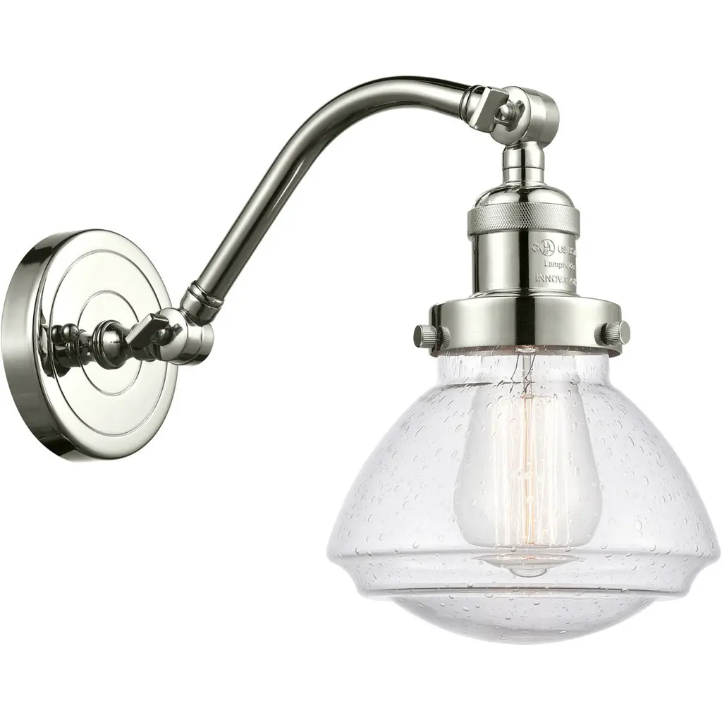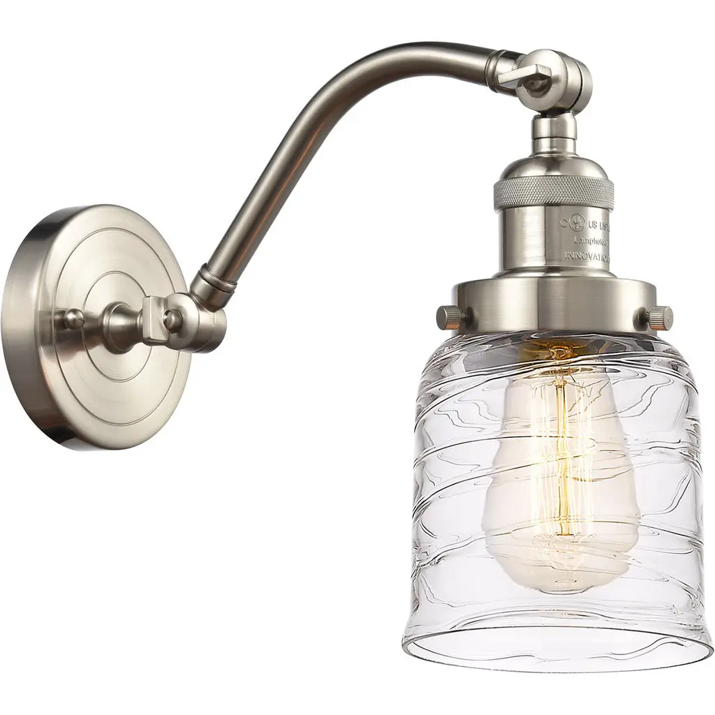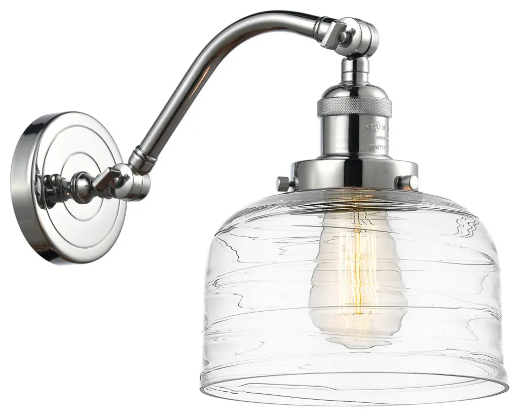 Innovations 515-1W-PN-G713-LED 1-Light Sconce Polished Nickel. Collection: Franklin Restoration. Style: Industrial, Farmhouse, Restoration-Vintage, Traditional. Metal Finish: Polished Nickel. Metal Finish (Canopy/Backplate): Polished Nickel. Material: Steel, Cast Brass, Glass. Dimension(in): 11. 5(H) x 8(W) x 10(Ext). Bulb: (1)6W Medium Base,Dimmable(Not Included). Maximum Wattage Per Socket: 100. Voltage: 120. Color Temperature (Kelvin): 2700. CRI: 82. Lumens: 600. Glass Shade Description: Clear Deco Swirl Large Bell. Glass or Metal Shade Color: Clear Deco Swirl. Shade Material: Glass. Glass Type: Transparent. Shade Shape: Bell. Shade Dimension(in): 8(W) x 5. 75(H). Fitter Measurement (Glass Or Metal Shade Fitter Size): 3. 25 inch Fitter. Canopy Dimension(in): 4. 5(Dia). Backplate Dimension(in): 4. 5(Dia) x 0. 75(Depth). California Proposition 65 Warning Required: Yes. UL and ETL Certification: Damp Location.