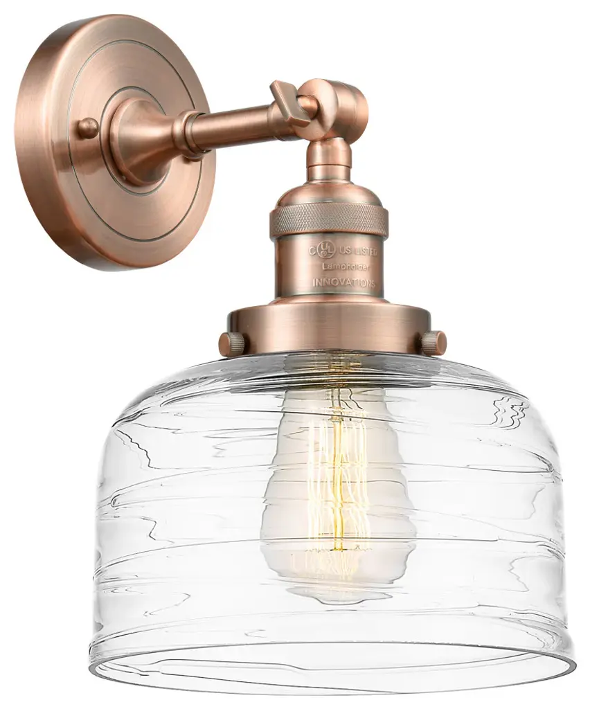 Innovations 515-1W-SG-G713 1-Light Sconce Satin Gold. Collection: Franklin Restoration. Style: Industrial, Farmhouse, Restoration-Vintage, Traditional. Metal Finish: Satin Gold. Metal Finish (Canopy/Backplate): Satin Gold. Material: Steel, Cast Brass, Glass. Dimension(in): 11. 5(H) x 8(W) x 10(Ext). Bulb: (1)60W Medium Base,Dimmable(Not Included). Maximum Wattage Per Socket: 100. Voltage: 120. Color Temperature (Kelvin): 2200. CRI: 99. 9. Lumens: 220. Glass Shade Description: Clear Deco Swirl Large Bell. Glass or Metal Shade Color: Clear Deco Swirl. Shade Material: Glass. Glass Type: Transparent. Shade Shape: Bell. Shade Dimension(in): 8(W) x 5. 75(H). Fitter Measurement (Glass Or Metal Shade Fitter Size): 3. 25 inch Fitter. Canopy Dimension(in): 4. 5(Dia). Backplate Dimension(in): 4. 5(Dia) x 0. 75(Depth). ADA Compliant: No. California Proposition 65 Warning Required: Yes. UL and ETL Certification: Damp Location.